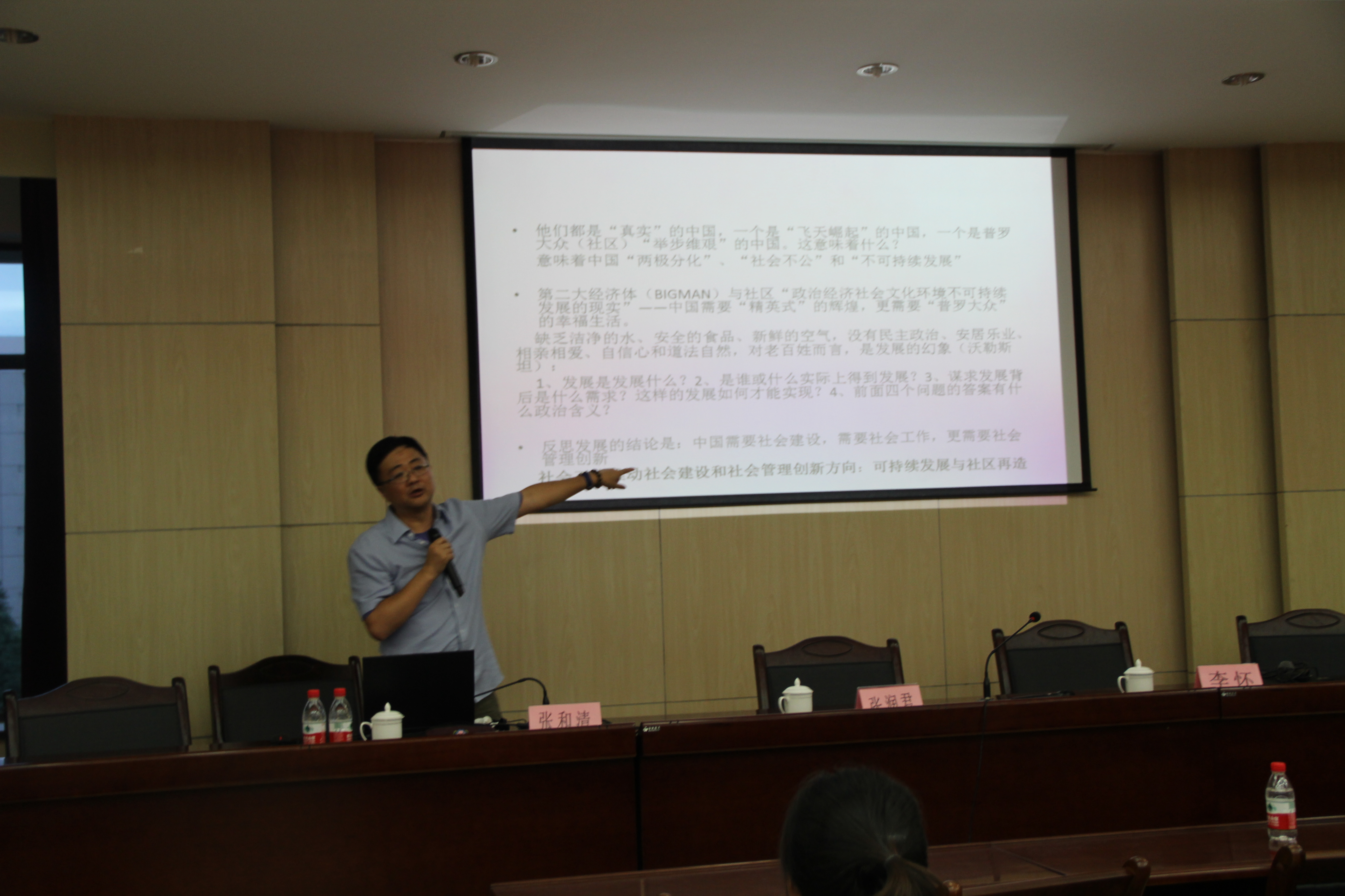 6月26日晚上,应学院邀请,中山大学社会工作系主任张和清教授在教学10号楼D区四楼多功能报告厅作了一场题为“社会工作与社区可持续发展”报告,报告会由我院副院长张润君教授主持。学院部分教师、研究生、本科生共150余人参加了本次报告会。