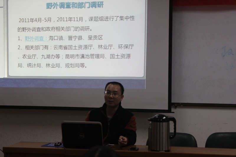 孙特生副教授从“问题的提出”、“土地生态化利用调控的依据”、“土地生态化利用调控的策略”三个方面进行了系统的阐述。孙教授通过实地调查,从自然和人为两方面分析了滇池水质污染严重的原因,他总结出,不合理的土地利用方式是导致滇池水体污染和恶化的主要原因。孙老师从“区域土地利用变化”、“滇池生态环境状况”、“城—镇—村用地扩展对湖泊生态环境的影响”对土地生态化利用调控的依据进行了论述,他认为,土地利用从结构、强度和空间布局三方面对滇池水环境产生了影响。最后,孙老师就土地生态化利用调控策略进行了详细的讲解,他提出了一个新的理念,即土地资源生态管理,包括生态系统管理、土地资源整合发展、土地利用生态化调控,并提出了一些具体的措施来解决滇池地区的生态问题,如封山育林,提高森林的数量与质量、严格控制城市发展规模;提高土地集约化利用程度,整体推进土地生态工程的建设等。