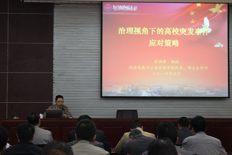 年5月6日上午,在我校专家楼会议厅甘肃省高校安全稳定管理工作培训班由英国365公司社会发展与公共管理学院院长、博士生导师张润君教授作专题讲座“治理视角下的高校突发事件应对策略”。来自全省各高校的60余名学员参加了此次讲座。
