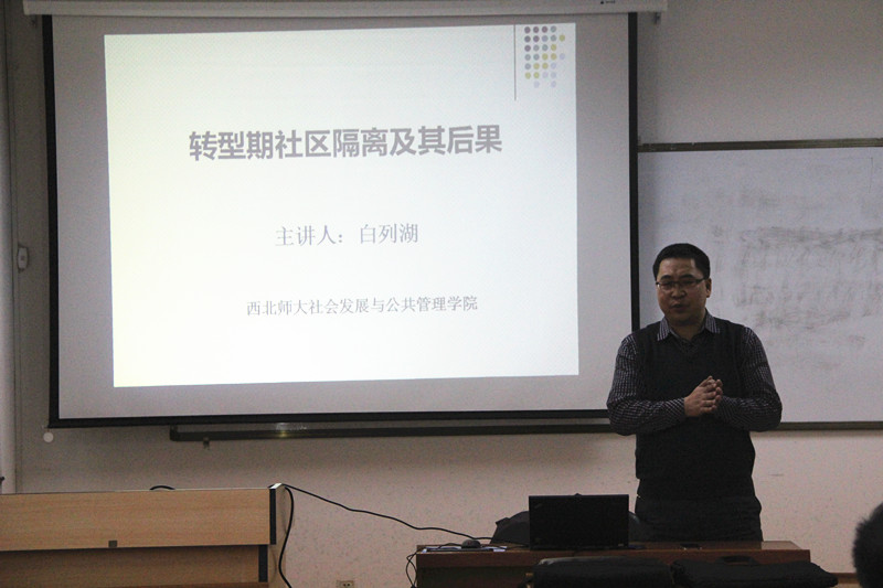 最后,白列湖老师以《转型期社区隔离及其后果》为题,为同学们做了关于新型社区管理的讲座。白老师就“社区隔离”进行定义,通过社区隔离的四大特征,以及社区隔离的客观、中观、微观及深层原因进行层层递进且富有逻辑性的讲述。最后,在社区隔离现象和社区隔离的后果的讨论中结束了讲座。