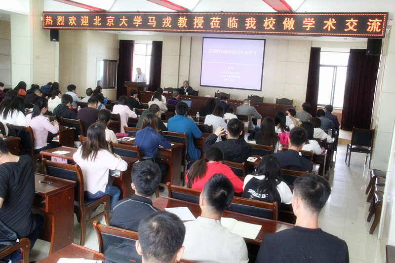 应我校社会科学处和社会发展与公共管理学院的邀请,北京大学社会学系前系主任、博士生导师、著名社会学家马戎教授于2017年9月24日上午在我校作了题为《汉语的功能转型与双语教育》的学术报告。报告在教学10号楼D区四楼报告厅举行,社管院和其他学院的教师和研究生约两百人参加。报告由贾应生教授主持。