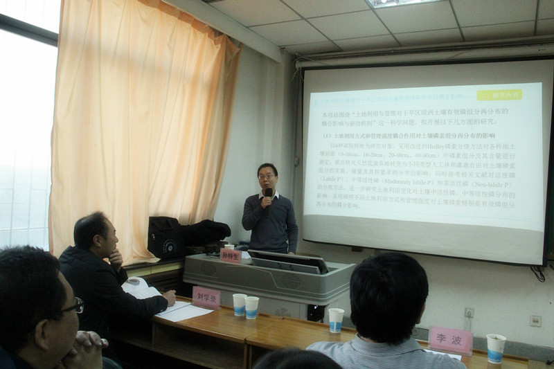 首先,孙特生博士对研究对象土壤磷素的重要性做了解释,介绍到土壤磷素是植物生长所需的矿物质元素,但是陆地生态系统有效磷普遍缺乏,这也是其研究土壤有效磷的原因以及必要性;接着孙特生博士介绍了本项目的具体研究区域选定为干旱区绿洲的原因;进一步其讲述了土地利用与管理对土壤磷素组分、有效性的影响研究现状及动态,也是为了证明不同土地利用对于土壤有效磷素的转化的作用不同,土地利用/植被覆盖的变化影响地球化学过程,进而影响有效磷再分布,土地利用的方式还能够影响土壤养分的输入和输出;在这些理论铺垫之后,其介绍了施肥、灌溉耕作这三种土地管理方式,还有影响有效磷素再分布的直接的--生物和非生物的影响和间接地--人类活动的影响的有机关系;如上的阐述再一次明确其研究的必要性和意义;接着孙特生博士讲道项目依托黑河中游临泽野外景观测试研究平台,以临泽六种典型土地利用作为研究对象,其中干旱荒漠为对照组,从景观尺度和样地尺度出发,研究土地利用和管理对土壤有效磷素的再分配的作用强度的关系,来为干旱区域土地利用管理提供科学依据;在讲述研究方向之后,孙特生博士对如何顺利研究进行的具体方面的介绍,主要有:土地利用方式和管理强度耦合作用对土壤磷素组分再分布的影响、对土壤磷素化合物再分布的影响以及干旱区绿洲土壤有效磷组分再分布的驱动机制;主讲接着讲述为了保证研究进行的顺利进行,其研究的思路、技术路线、样带设计、样地选择、土样采集选择、土样分级分析以及需要用到的数理统计分析;最后阐述了自己对于研究的自身的期待成果。