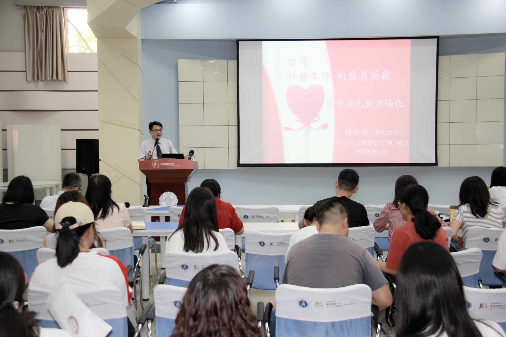 2018年6月13日16:30,台湾佛光大学社会科学暨管理学院院长、社会学系林大森教授应我院邀请在教师发展中心学术报告厅作了题为“台湾社会工作的发展历程:从专业化到市场化”的专业学术讲座。我院社会工作、社会保障等专业的研究生、部分教师约100多人参加,讲座由社会工作系主任马克林教授主持。