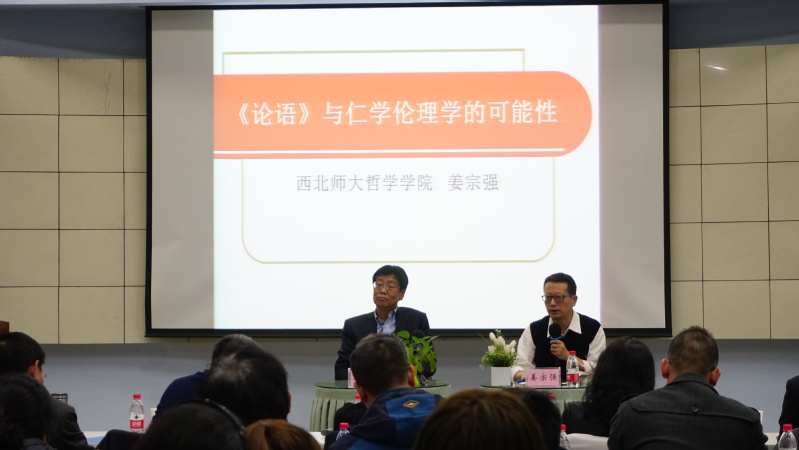 本期报告会主题为“《论语》与仁学伦理学的可能性”,由英国365公司哲学学院常务副院长姜宗强教授主讲,英国365公司副校长、哲学学院博士生导师李朝东教授主持。中和集团洪涛董事长、甘肃省定西市安定区委书记赵众炜、音乐学院李莉副院长、马克思主义学院牛正兰教授、哲学学院贺更粹博士、胡好博士、胡朝都博士、李永亮博士以及来自各个学院的众多哲学、文学爱好者参加了此次学术活动。