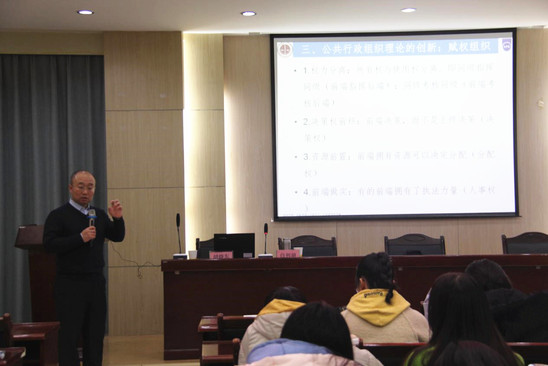 12月17日下午,应学院邀请,中国政法大学胡晓东教授莅临我院在10D四楼学术报告厅作学术讲座,报告主题为“未来公共行政组织的发展与设计”,社会发展与公共管理学院部分研究生与本科生共100余人参加讲座。本次讲座由我院行政管理系白列湖老师主持。