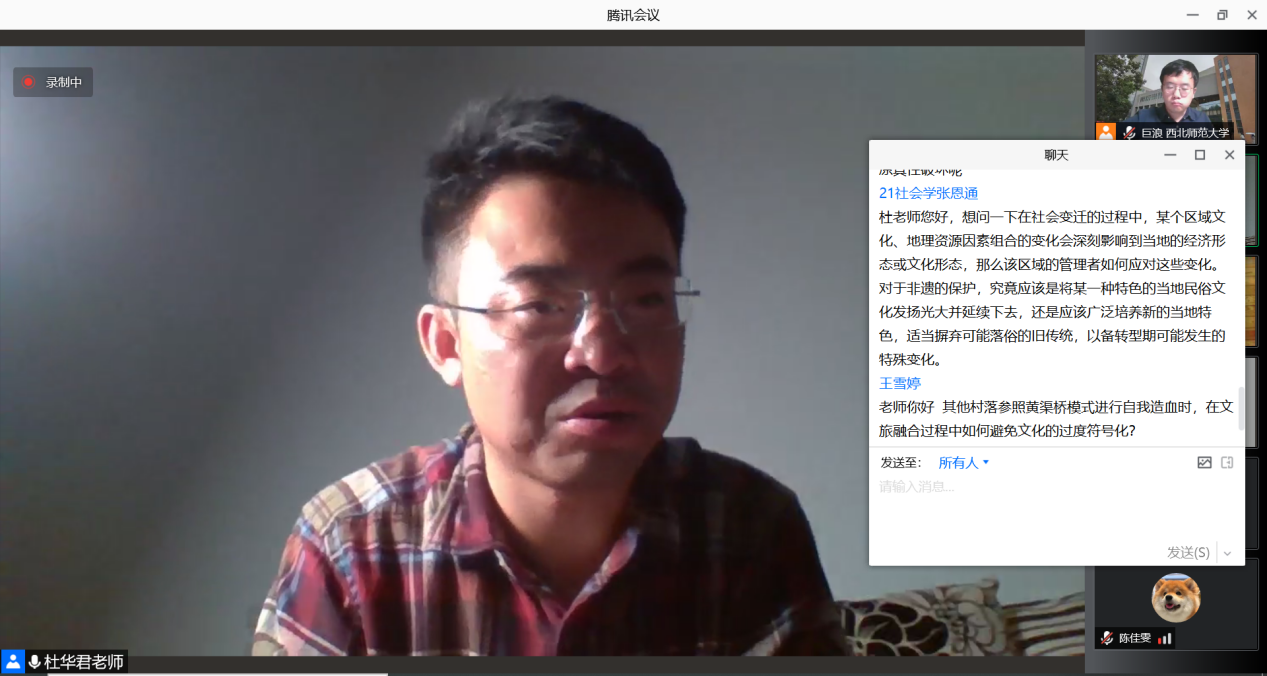 11月6日晚,应学院邀请,北方民族大学杜华君老师为我院作学术报告,由于疫情防控风险,报告以线上会议形式展开。报告题目为“文化遗产的‘传统-现代’转型与乡村振兴的内源性动力——基于新古典‘结构-功能论’的人类学分析”。有260余人参加了此次讲座。本次讲座由我院巨浪老师主持,由旅游学院柴亚林副教授评议。