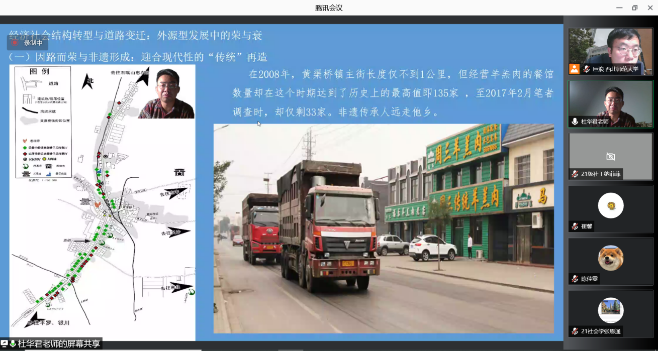 首先,杜老师谈到他是以宁夏黄渠桥镇近十年来的文化遗产开发为个案,以当地一个非物质文化遗产的“结构-功能”变迁为主线展开历史性考察,从而揭示该镇如何利用本土资源创造文化内驱力和如何通过文化遗产的“传统-现代”转型来实现乡村振兴的地方智慧,以期为我国当前思考具有特色地方文化的传统乡村如何全面推进乡村振兴,提供一种内源型发展的新思路。