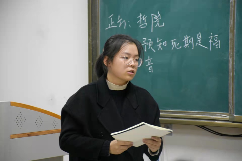 反方三辩何壮:“‘朝闻道,夕死可矣。’哲学是一门爱智慧的学科,是一门关于智慧的学问。而学习哲学的过程,就是一个“求道”的过程,其目的就在于了解我们所生活的世界,得闻大道。在此次哲学日系列活动中,坚定了我继续学习哲学的决心,也坚定了弘扬中国传统哲学的理想。希望越来越多的人能学哲学,爱哲学,追寻生命的真谛。”