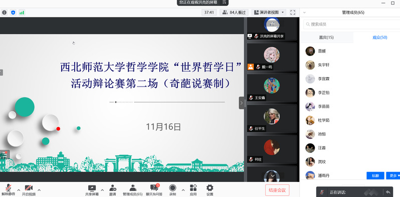 11月16日,来自2020级和2021级哲学本科班的6名辩手开始了第二场辩论赛的角逐,本场比赛的辩题是“不靠谱的梦想要/不要劝阻”,由任万明老师、孙玥老师和学院辩论队队长王颁尧同学担任评委。
