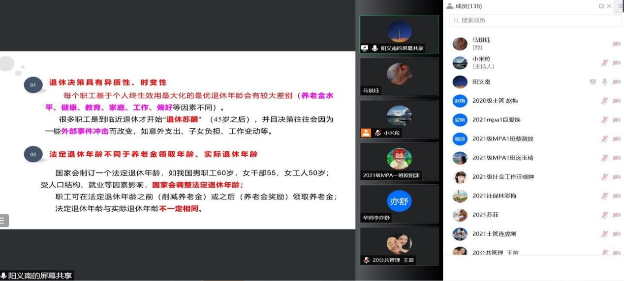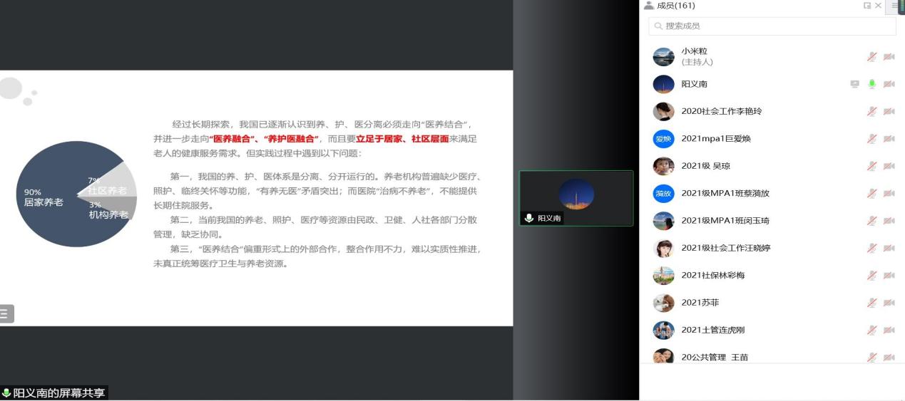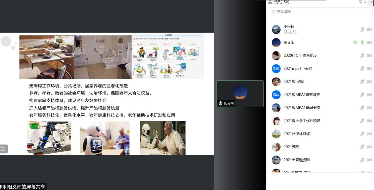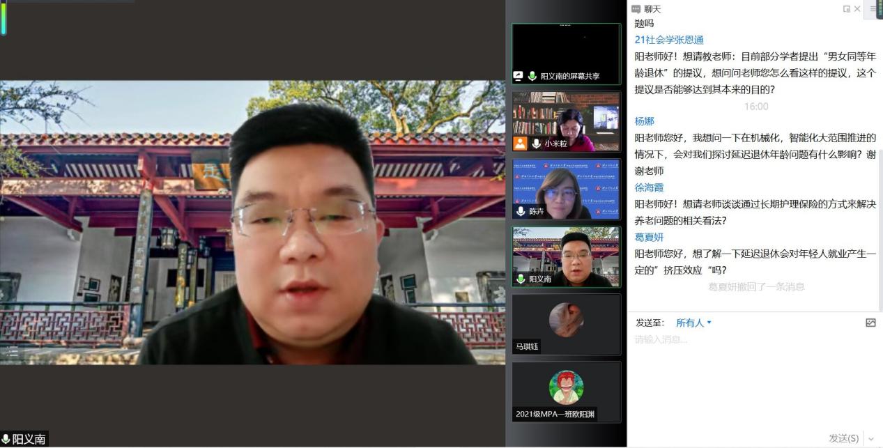 2021年11月18日下午,湖南大学博士生导师阳义南教授在腾讯会议上为我院众师生带来一场名为“中国老龄政策研究的十个认识”的主题讲座。社会发展与公共管理学院师生百余人在线学习。本次讲座由陈卉副教授主持,由戈银庆教授担任讲座评议人。