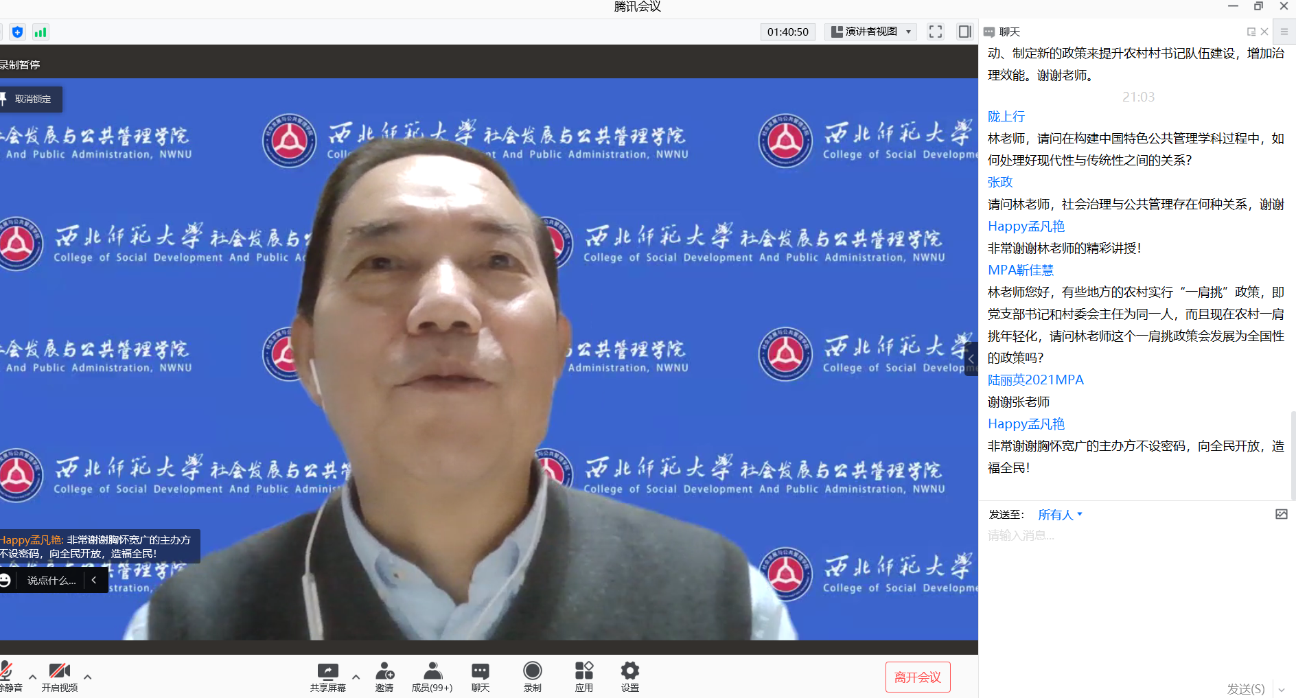 在答疑讨论阶段,林闽钢教授同我院学生进行了精彩的问答互动。高克凡同学提出,“当前农村村书记选拔机制(比如限制年龄、限制户口)等方面是否影响了我国的治理效能,面对现在乡村治理现状,如何采取新的行动、制定新的政策来提升农村村书记队伍建设,增加治理效能”。这个问题引发了参会学生的广泛思考,大家在听了林教授的解答以后也积极提出自己的见解,线上讲座浓厚的学术氛围让林教授更加期待能够亲自来兰州与英国365公司师生进行一次面对面的学术交流。最后,张文礼教授代表英国365公司全体师生感谢林教授的精彩分享,为大家贡献了一场丰富的学术盛宴。