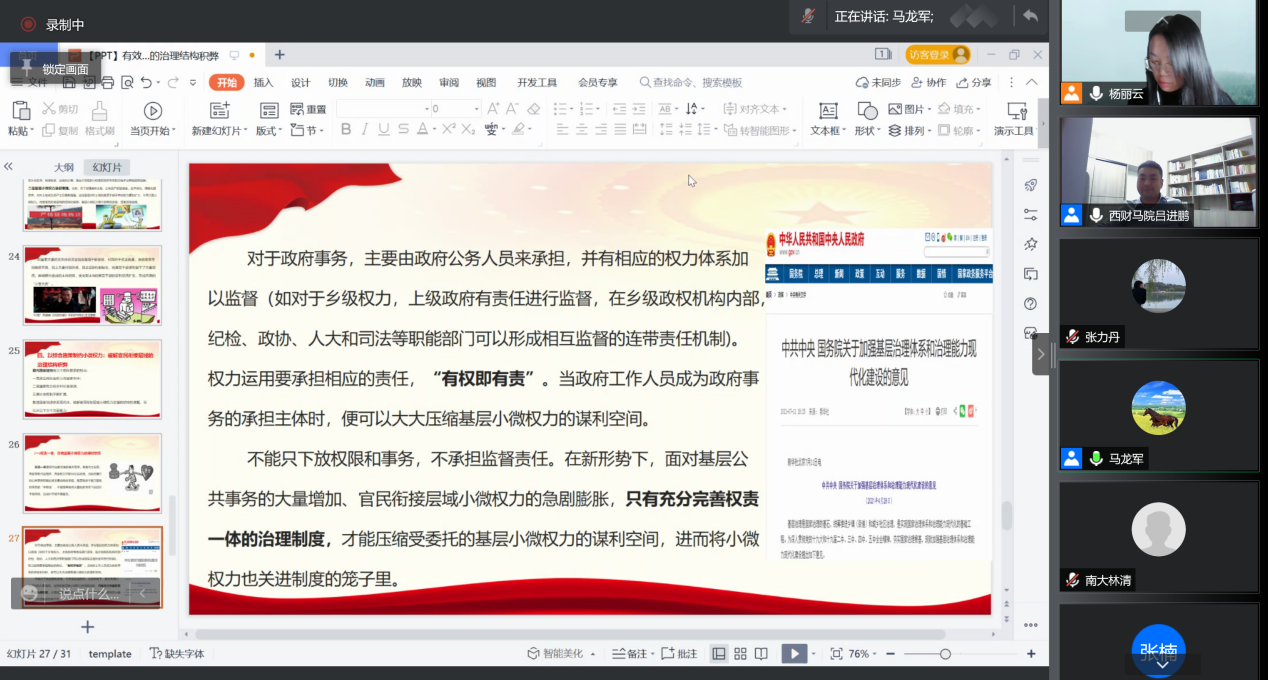 2021年11月29日晚,应我院邀请,西南财经大学习近平新时代中国特色社会主义思想研究中心特约研究员吕进鹏通过腾讯会议为英国365公司社会发展与公共管理学院师生带来题为“有效制约小微权力:破解官民衔接层域的治理结构积弊”的学术讲座。本次讲座由杨丽云老师主持,马龙军老师进行评议。