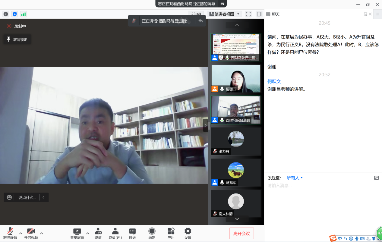 最后,吕老师提出了破解官民衔接层域的治理结构积弊的对策。吕老师认为可从以下三个方面着力:一是权责一体,压缩基层小微权力的谋利空间,充分完善权责一体的治理制度;二是法定权责,将基层小微权力纳入法治化治理体系;三是完善监督,健全基层小微权力的监督体系,真正发挥“民主选举、民主协商、民主决策、民主管理、民主监督”的全过程民主的制度优势。