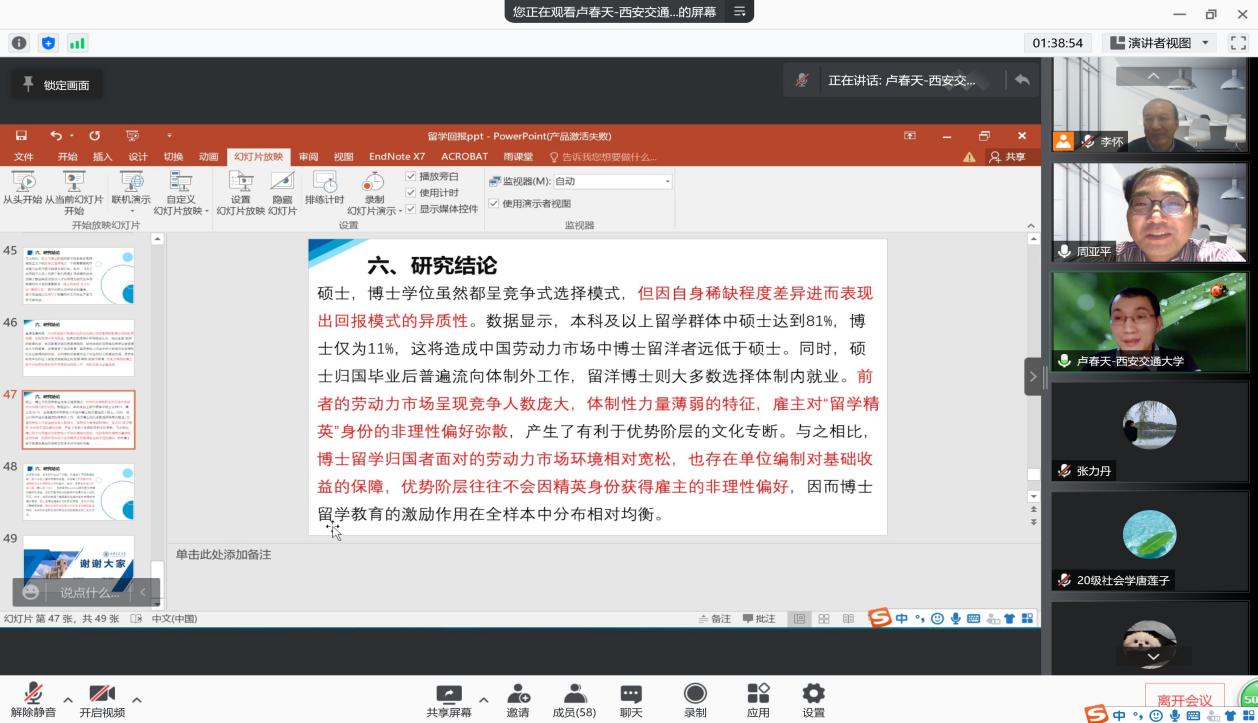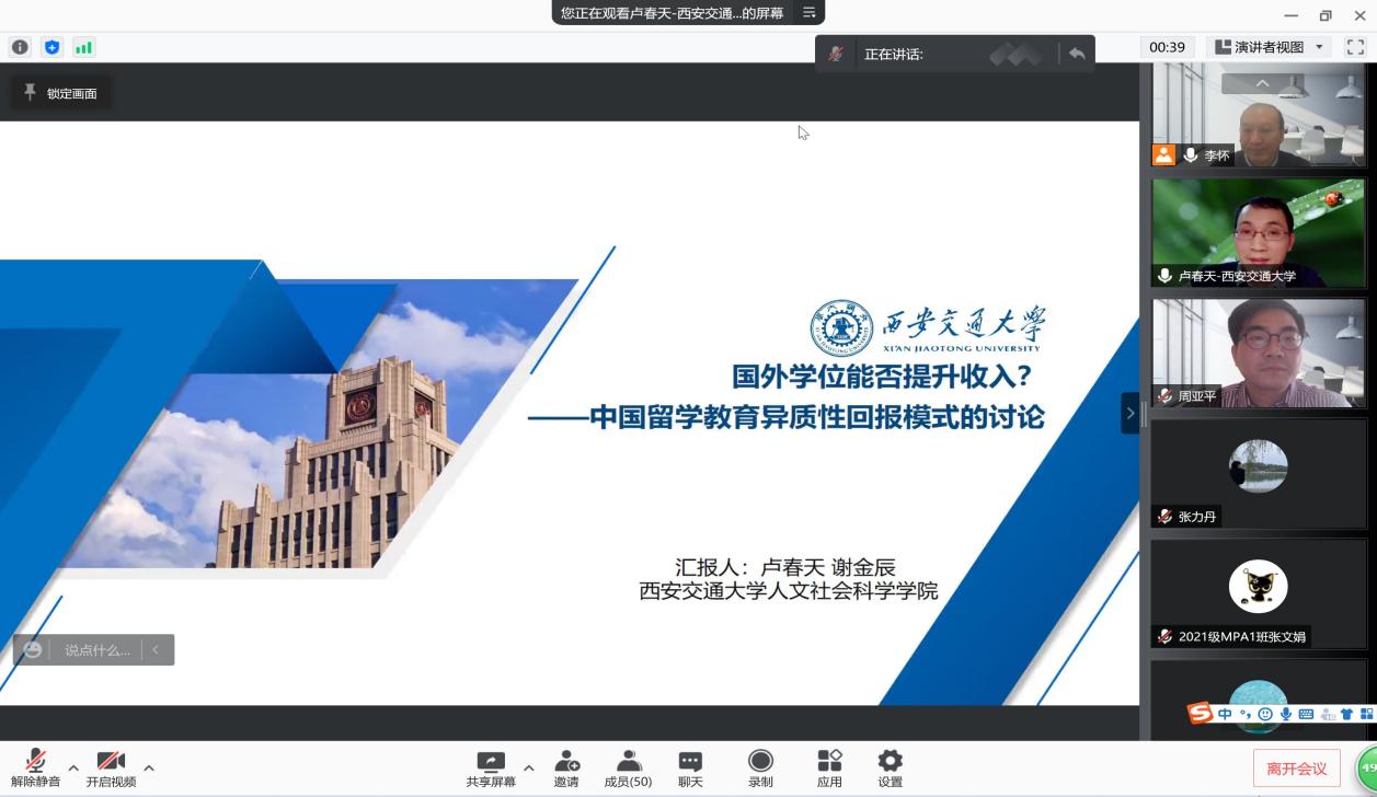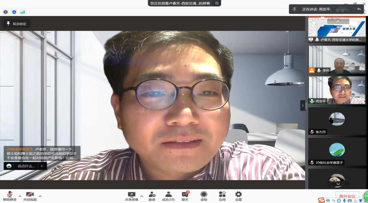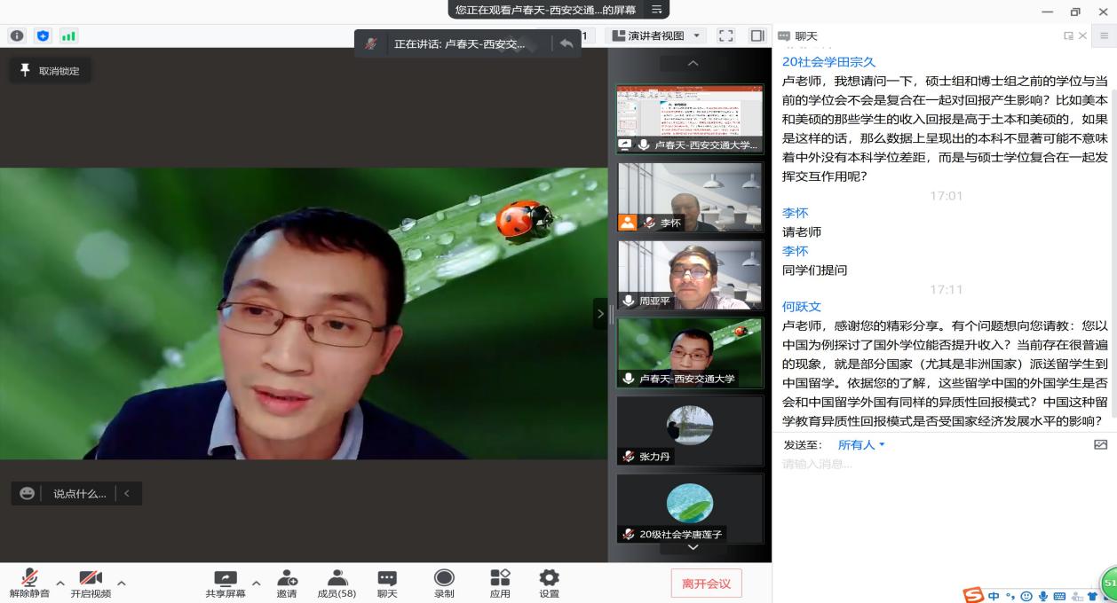 2021年12月2日下午,应我院邀请,西安交通大学社会学系教授卢春天在腾讯会议上为我院师生带来一场名为“国外学位能否提升收入?——中国留学教育异质性回报模式的探讨”的学术讲座。社会发展与公共管理学院部分研究生在线参加。本次讲座由李怀教授担任主持人,兰州大学周亚平教授担任与谈人。