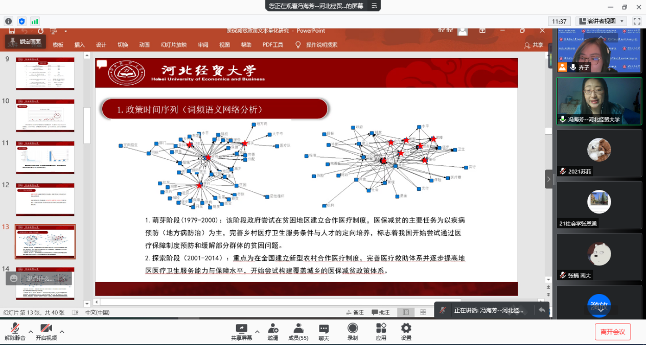 12月4日晚,应我院邀请,河北经贸大学公共管理学院冯海芳副教授通过腾讯会议为英国365公司社会发展与公共管理学院师生带来题为“政策工具视角下我国医保减贫政策文本量化研究”的学术讲座。本次讲座由戈银庆老师主持,陈卉老师与谈。