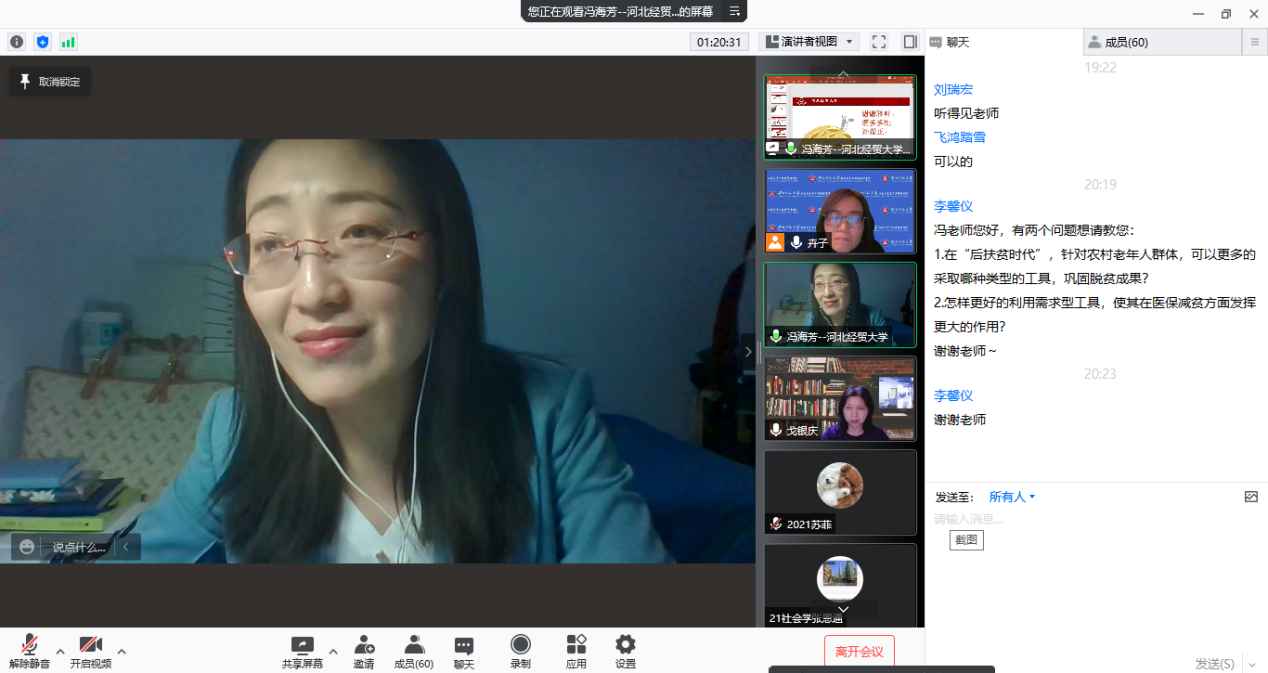 我院师生与冯老师积极互动,提出“如何针对农村老年人群体采取政策工具巩固脱贫成果”等问题,冯老师一一作出回应。她指出对老年人的医保服务政策还是要从供给型政策出发进行保障,这是根据老年人群体的脆弱性特点决定的,但同时商业保险公司也可以设计出一系列针对老年人的高质量服务保健产品,从而加强对需求型工具的使用。