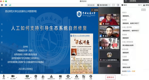 12月9日晚,应我院邀请,中国地质大学白中科教授通过腾讯会议为全院师生带来题为“人工如何支持引导生态系统自然修复”的学术讲座。本次讲座由刘春芳教授担任主持人,甘肃农业大学陈英教授担任与谈人。