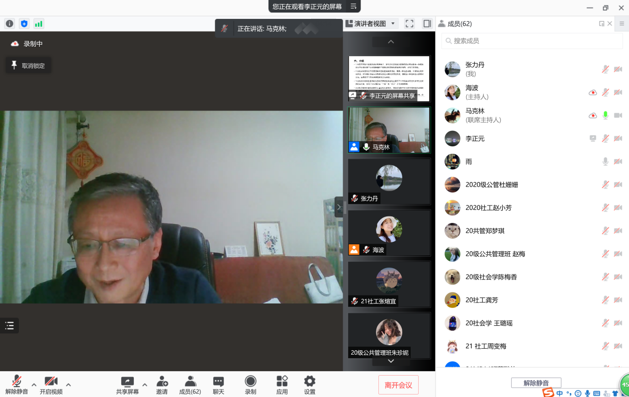2021年12月13日晚,社会发展与公共管理学院邀请兰州大学李正元副教授开展题为“多元一体”中国的区域关系路径——谷苞农牧互动共生论的线上专题讲座。此次讲座由我院讲师包海波老师担任主持人,马克林教授担任与谈人,学院全体研究生参加听取了讲座。