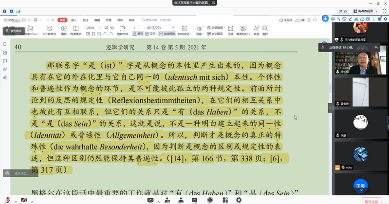报告会上,徐教授从黑格尔对主谓词“有”和“是”的区分开始,分别讨论了黑格尔对判断的分类,质的判断与反思的判断,概念的判断等内容。徐教授以条分缕析、抽丝剥茧的细致的文本解读方法,使师生对黑格尔思辨哲学的深刻性和论辩性的魅力产生了极大的兴趣。