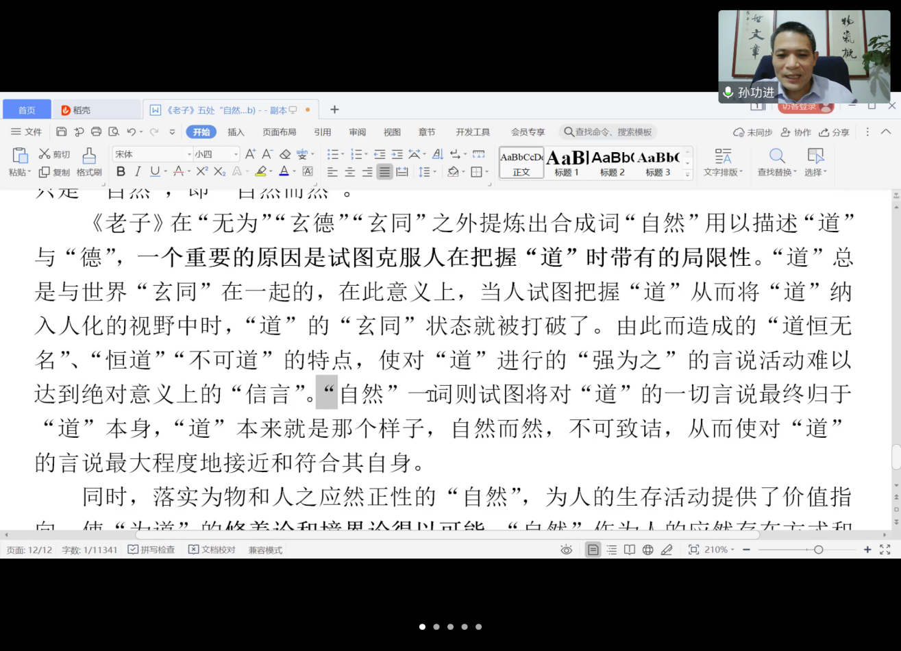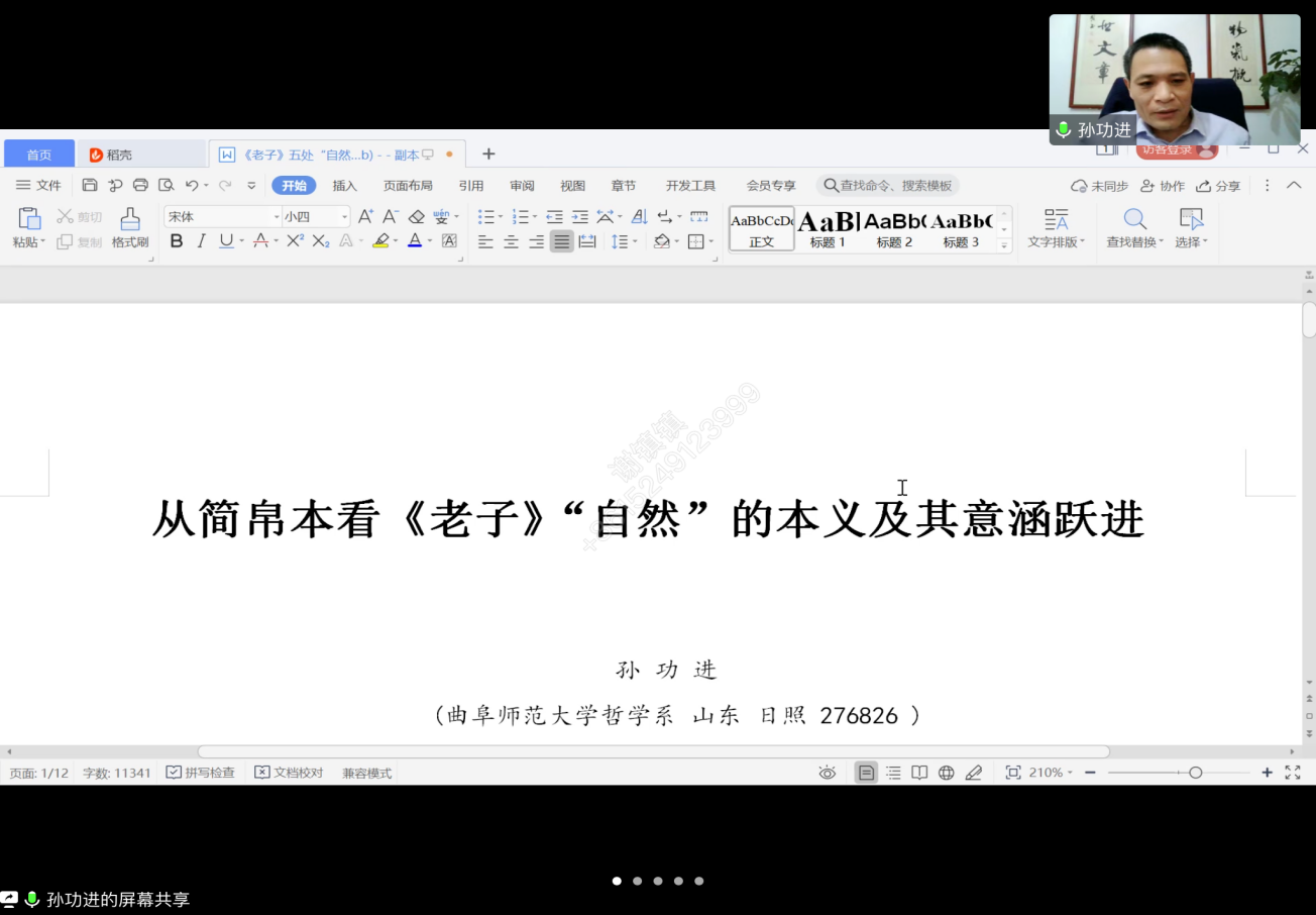 11月23日,作为学校百廿校庆学术活动和学院“世界哲学日”系列讲座之一,曲阜师范大学哲学系孙功进教授应邀通过腾讯会议为全校师生作了题为《从简帛本看<老子>‘自然’的本义及其意涵跃进》的学术报告。本次学术报告是哲学学院2021世界哲学日系列学术讲座之一,哲学学院张立恩副教授主持报告会,学院师生及校内外哲学爱好者百余人参加学术报告会。