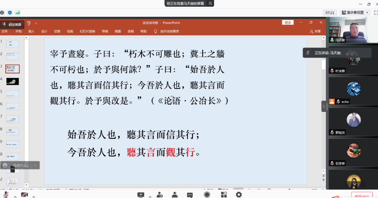 马天俊教授首先运用《论语》中的论述阐述了言与行的关系,用一张图表明了物、感官活动、言语与词之间的关系与差别。马教授讲到,物是世界的基本组成物,无论是否对它描述或命名,它都在那里,它只是某一具体的物。但当我们用天然官能活动去感受它,并且抽象出他的特征,用词去命名的时候,就完成了物与词之间的连接。言语的活动不是独立的,是需要在社会群体里形成的。我们要将言语活动与感官活动区分开。言语活动与感官活动的不同,既不能说是天然的,也不能说是个体的,言语它即是复杂生活的条件,也是复杂生活的结果。言语与社会相互依赖。感官作为天然官能,也有不确定性,言语活动也会比物的范围更加广阔。