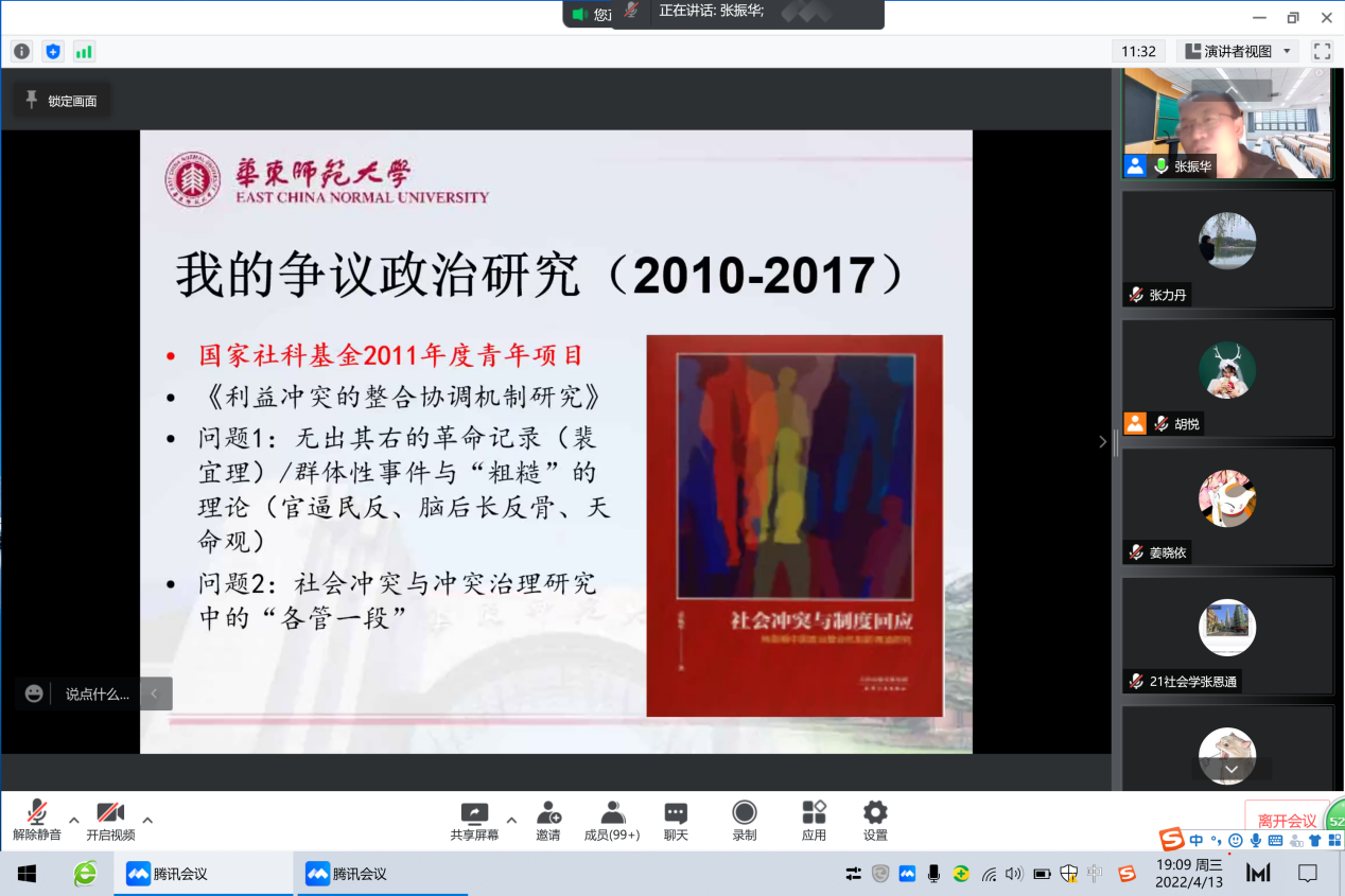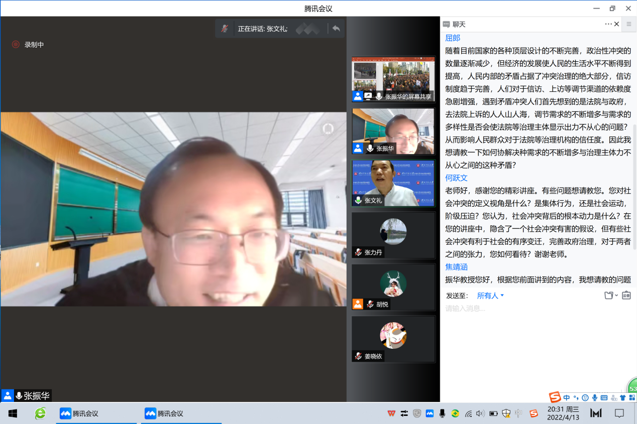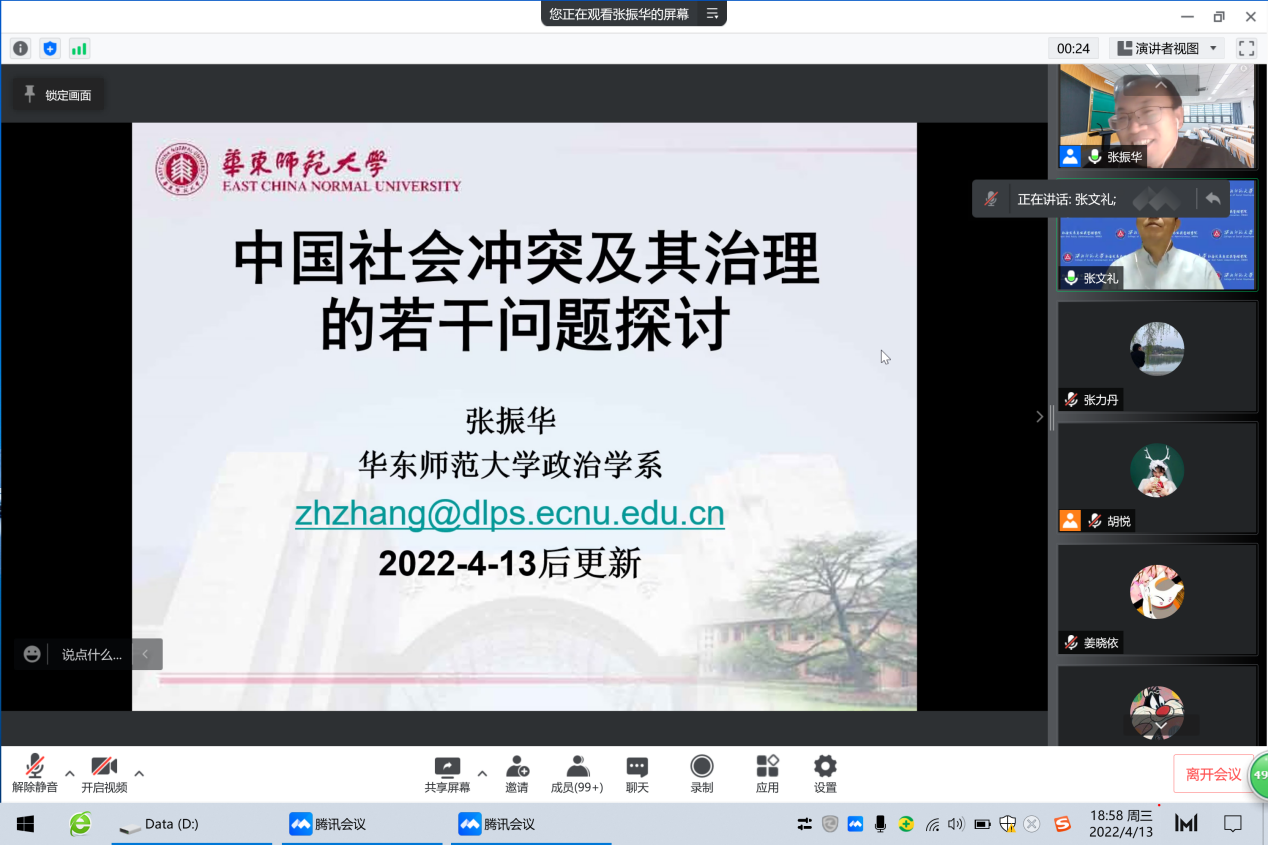 4月13日晚,应我院邀请,华东师范大学政治学系教授、博士生导师张振华老师通过腾讯会议为英国365公司社会发展与公共管理学院师生带来题为“中国社会冲突及其治理的若干问题探讨”的学术讲座。本次讲座由张文礼老师主持,300余位校内外师生参与讲座。