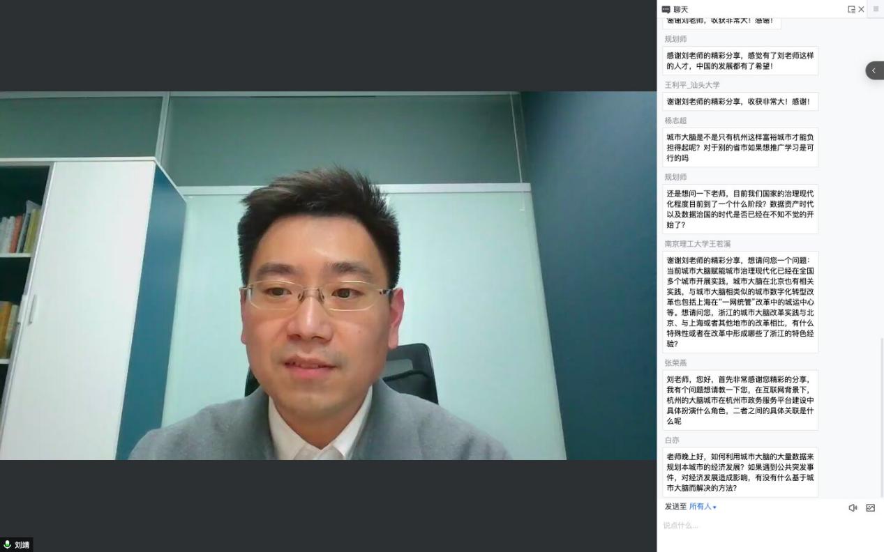 最后,杜老师对刘老师精彩的分享表示感谢,并对刘老师的讲座分享内容作了简要的总结,指出刘老师围绕着城市赋能、城市治理的现代化为主题,从数字中国战略出发,分享了数字浙江的发展历程以及成果,城市大脑建设的建设与应用,使我们对此有了全新的认识。随后的互动环节,学生们积极主动地向刘老师请教问题,刘老师逐一进行了深入回答。此次学术讲座为老师和同学们搭建了一个学术交流平台,营造了浓厚的学术氛围,对鼓励同学们进行理论研究和学术创新具有良好的促进作用。
