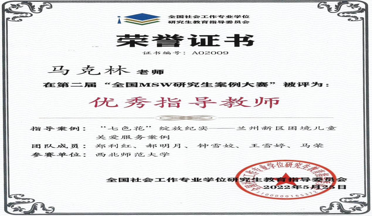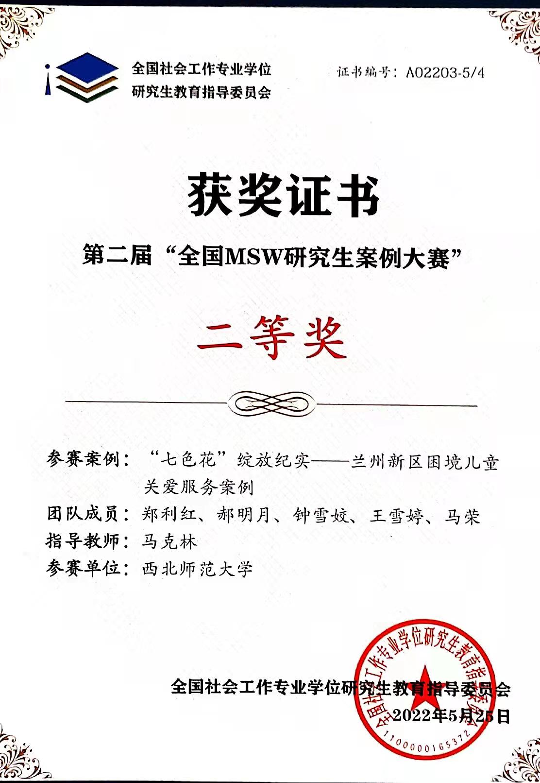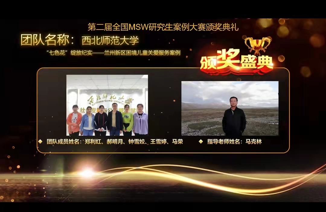 决赛于2022年5月15日举办,采用线上评审和答辩的方式,通过线上直播。决赛全程采取参赛选手与评委“双向匿名”的模式,评选出特等奖、一等奖、二等奖。由我院马克林教授指导,2021级MSW研究生郑利红(团队负责人)、郝明月、钟雪娇、王雪婷、马荣组队申报的《“七色花绽放纪实”——兰州新区困境儿童关爱服务案例》荣获大赛二等奖。马克林教授被评为第二届“全国MSW研究生案例大赛”优秀指导教师。