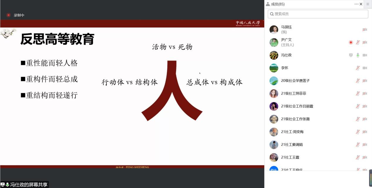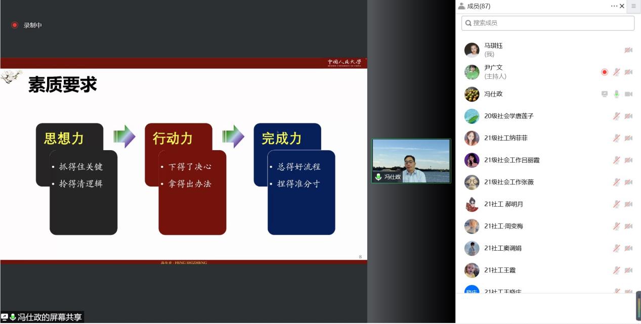 冯老师从立德树人、气质养成、田野实践三个方面对社会工作专业人才的培养要旨展开阐述。冯老师强调,大学培养人才的根本任务在于立德树人,其基本内容包括对学生的价值塑造、能力培养和专业知识传授,最终目标是将学生培养为堪当民族复兴大任的时代新人。冯老师从大学生答辩、求职、交作业等日常行为方面展示出的社会性不足等问题引入,对当下高等教育在人才培养方面存在的“重性能轻人格、重构建轻总成、重结构轻遂行”等误区进行反思,提出合格的专业人才应该具备的三重素养:逻辑清晰的思想力、勇于探索的行动力、分寸合宜的完成力。社会工作专业作为以改造社会的专业实践为目的导向的学科,在人才培养方面对上述三重素养的要求更是不容忽视。