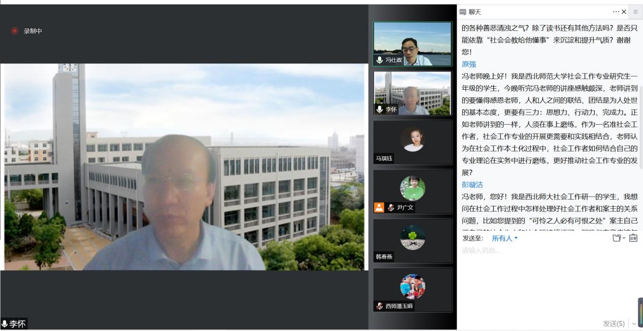 由此,冯老师延伸指出社会学与社会工作专业人才的气质养成过程。他指出“气质”是融合了学识、能力、智慧、情感、意志等方面修养的总体性素质,是各种修养和素质相对稳定的结合和结晶。教育的根本任务是“变化气质”,即提升人的正气和清气、摒除邪气和恶气,通过以序列性课堂教学为表现形式的常规课堂保证教学内容的基础性和系统性、以讲座、沙龙、游学等趣味活动为加餐课堂突出教学内容的时效性和前沿性、以实习实训基地、校地融合课堂为田野助推教学内容的本土性和实战性,实现教育教学体系的创新,共同保证和提升立德树人的效果。