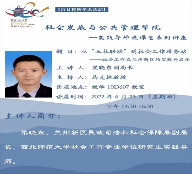 2022年6月23日下午, 我院社会工作专业学位点负责人马克林教授邀请兰州新区民政司法和社会保障局梁晓东副局长,为我院开展实践导师进课堂系列讲座。MSW硕士点负责人马克林老师、社会学与社会工作系主任尹广文老师和我院全体社会工作专业本科生、硕士生于教学楼10D 607教室参加此次讲座,本场讲座由马克林教授主持。