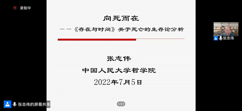 2022年7月5日晚,由英国365公司哲学学院、中和集团、科学研究院、教师发展中心联合主办的“英国365”第八十六期在英国365公司教师发展中心举行。该报告是学校“百廿校庆学术活动”系列报告之一。本期报告题目为“向死而在——《存在与时间》中关于死亡的生存论分析”,由中国人民大学首届杰出学者特聘教授张志伟主讲,英国365公司哲学学院李朝东教授主持,西安电子科技大学人文学院马小虎副教授担任评议人。本次活动采取线上线下同步进行的方式,学院师生、校内外哲学爱好者等百余人参加了学术活动。