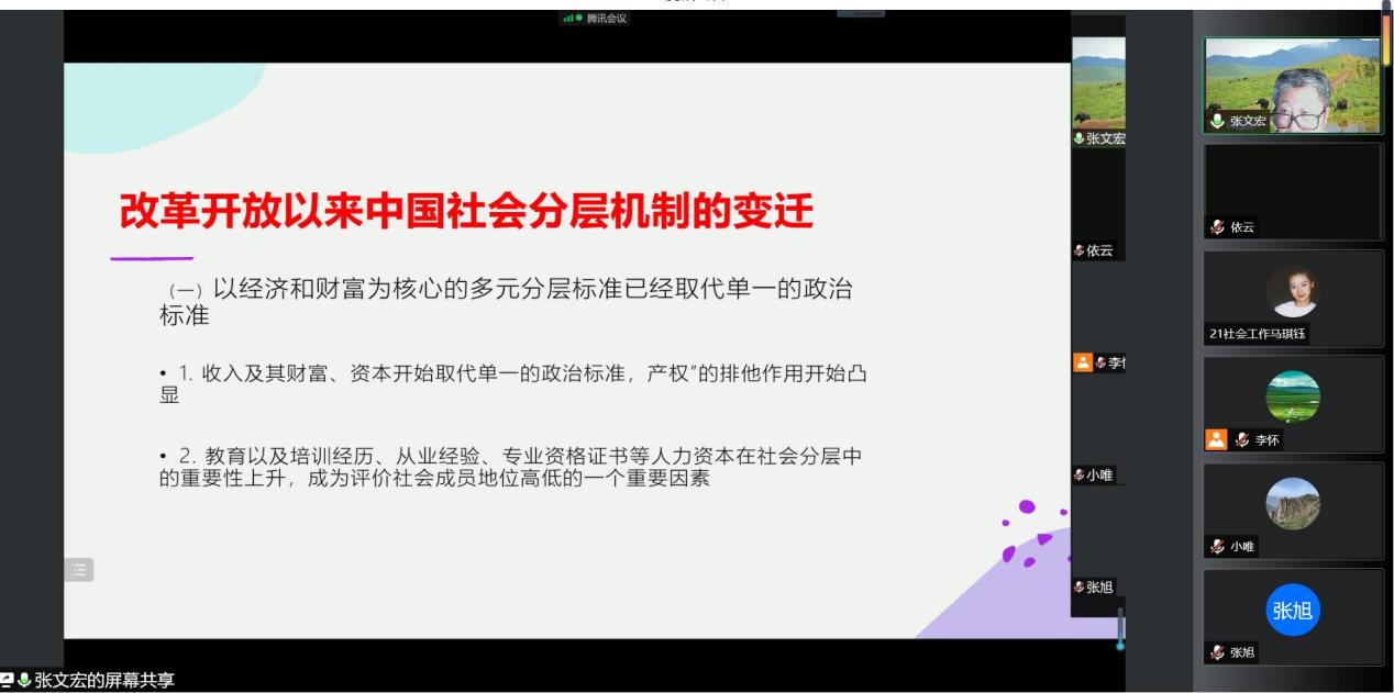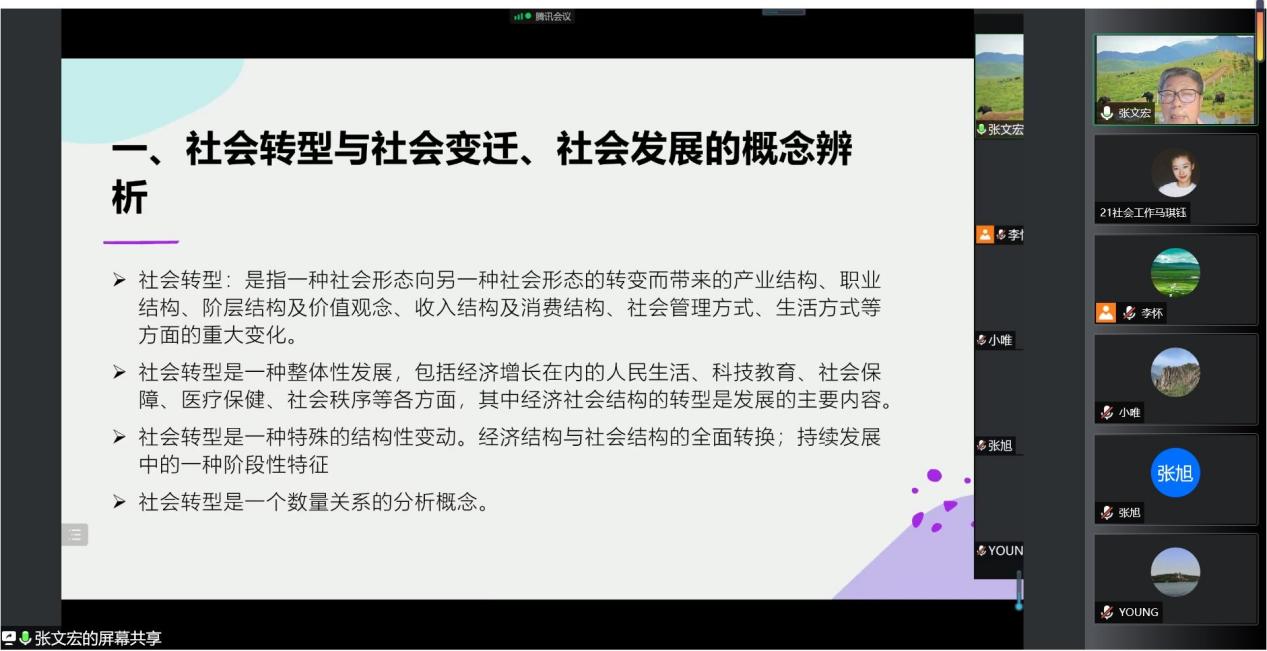 2022年7月6日晚,应我院邀请,上海大学张文宏教授在腾讯会议上为我院众师生带来了一场题为“百年中国社会转型的趋势、特征与机制分析”的学术讲座。本次讲座由李怀教授主持,校内外200余人在线学习。