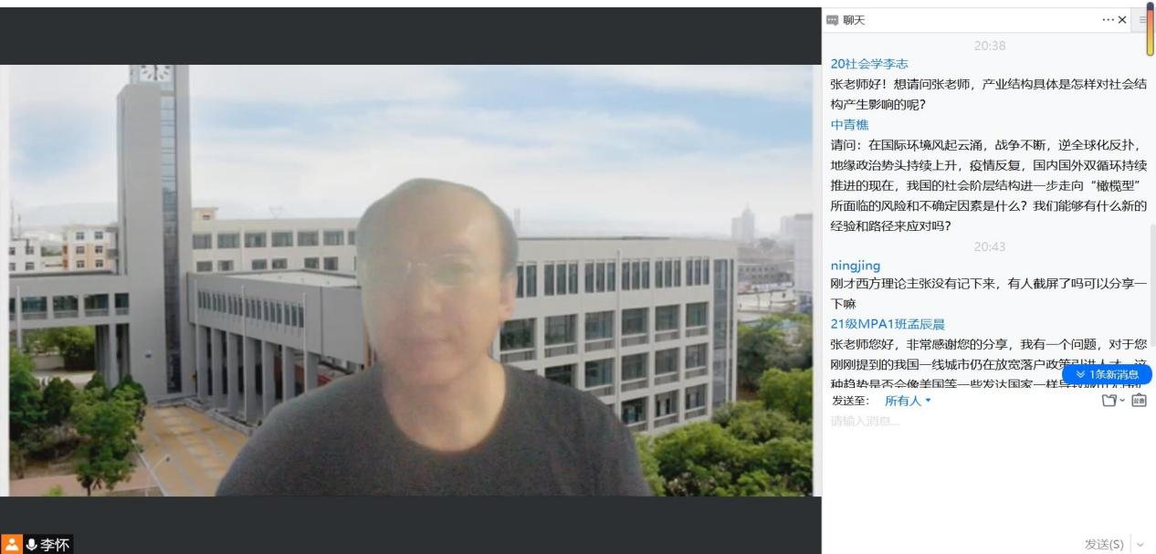 在交流环节,我院师生与张老师进行热烈互动,张老师耐心予以回应,一一进行了深入回答。李怀老师对张老师的分享表示感谢,并对张老师的讲座内容做了简要的总结,他表示此次讲座的分享给大家在社会制度、社会变迁和社会发展等研究方面给予了很大的帮助,是一次非常宝贵的学习经历,进一步开拓同学们的学术视野、提高学术研究能力。