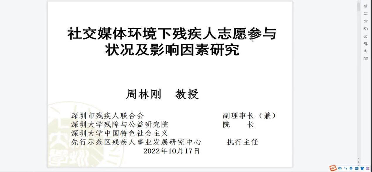 其次,周老师带来了其关于社交媒体环境下残疾人志愿参与状况及影响因素研究。周老师首先介绍了研究背景与研究目的,然后进行了文献与研究假设的简单回顾后主要分析了本文的数据来源与样本概况。最后对社交媒体、网络社会资本中残疾人志愿参与的“出钱”、“出力”和“出谋划策”三个影响因素进行了分析论证得出结论并提出政策建议。