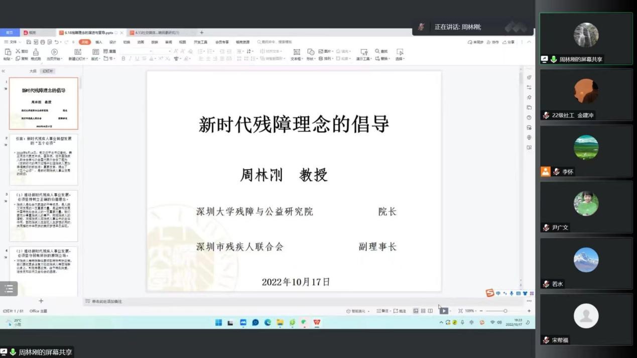 2022年10月17日19时,百廿校庆暨十年院庆校友论坛系列学术讲座第二场,由深圳大学周林刚教授开讲。周老师为我院师生作题为“残障理念的演进与倡导”的学术讲座。本次讲座由李怀教授主持,兰州大学焦若水教授作评议人。