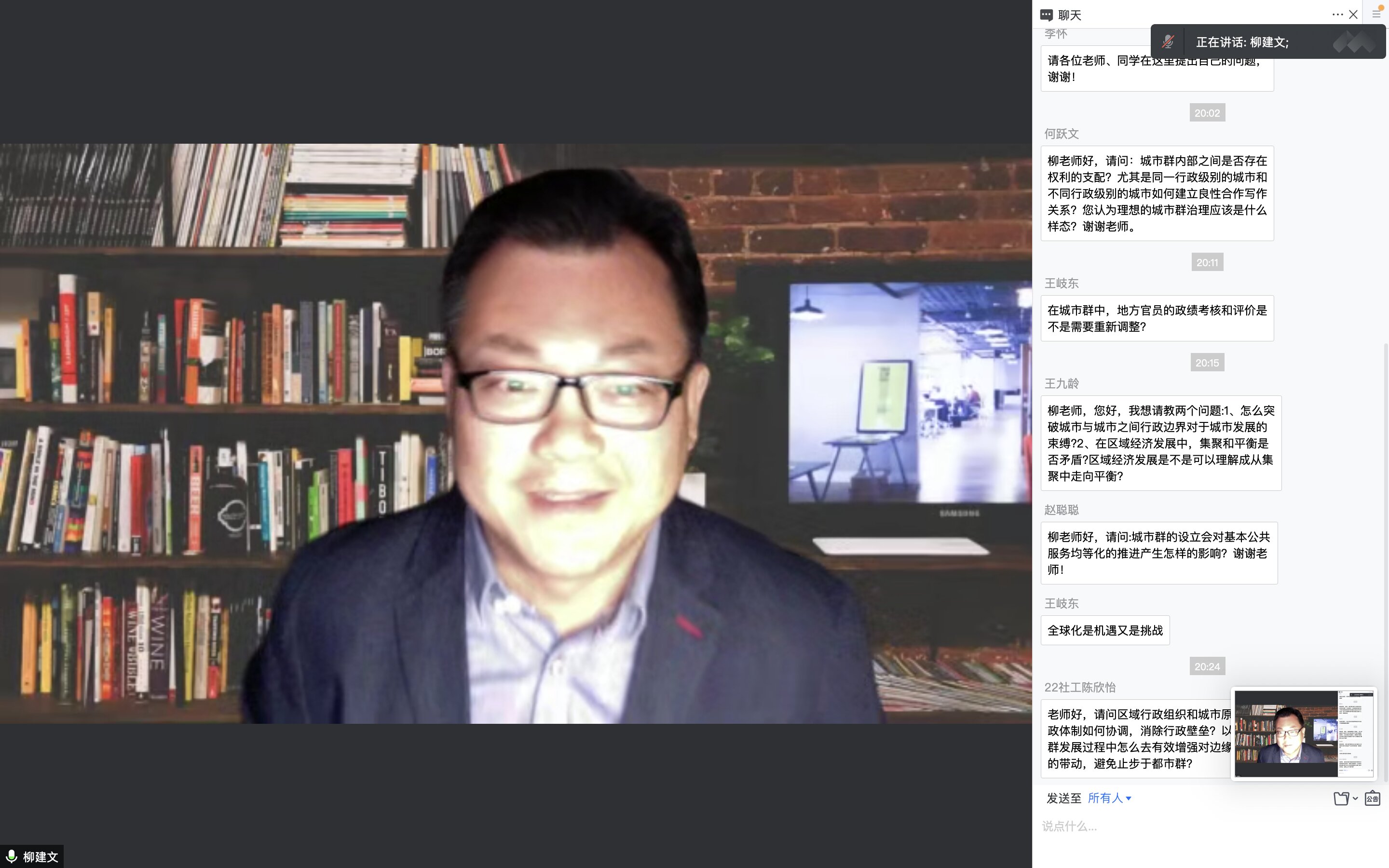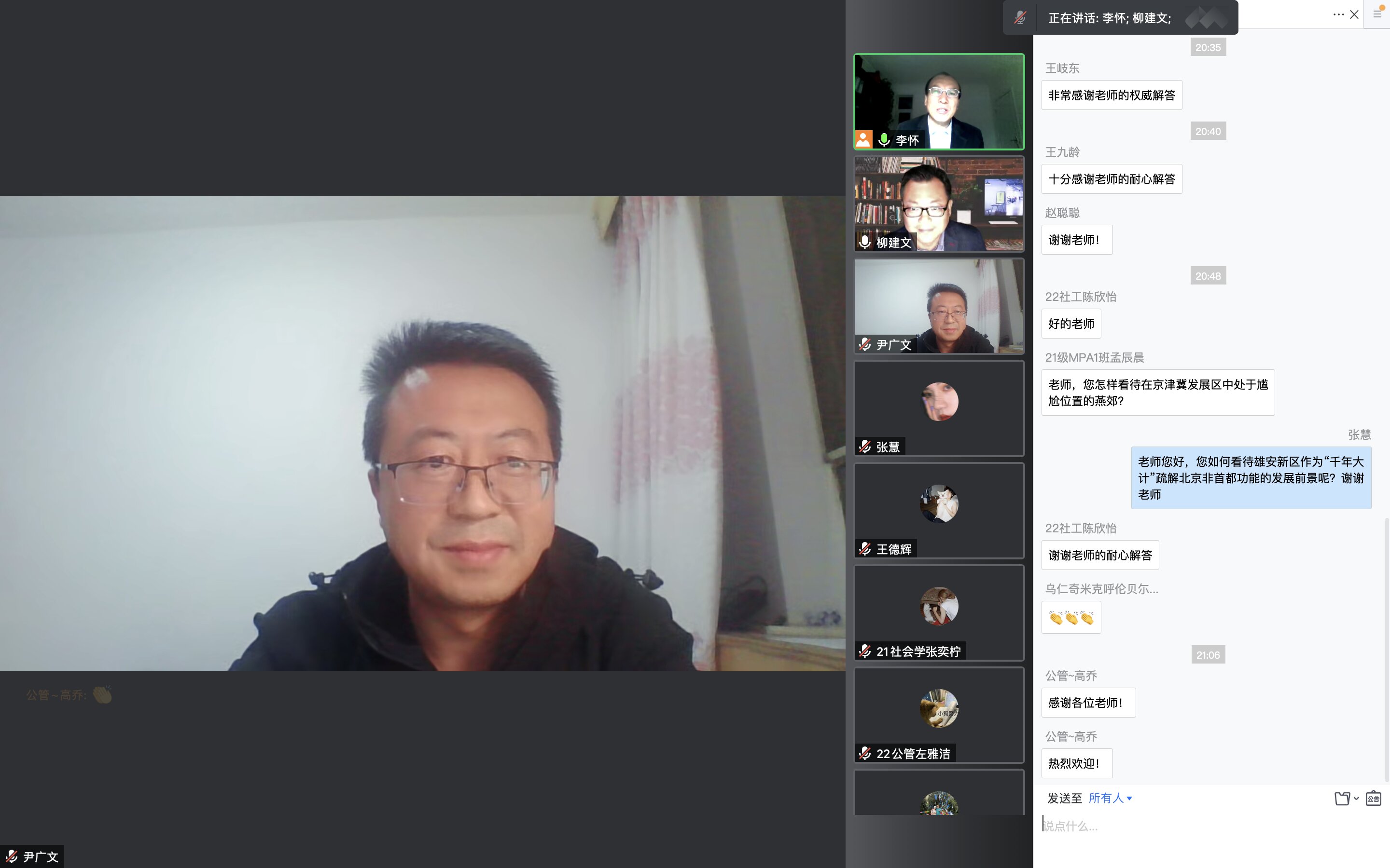在交流互动环节中,我院师生与柳老师关于城市群的治理问题进行了讨论与交流。柳老师对同学们所提的问题做了一一解答。讲座尾声,尹广文老师对本次讲座做了总结和分享:第一,城市群发展和研究的视角关切:(1)在城市群研究视角中注重空间形态的研究和主客体关系的互动;(2)城市群发展研究中关注结构要素与社会基础研究(3)在城市群发展中共性和差异性的研究。第二,城市群发展研究中的问题意识:(1)以“京津冀”为例提出城市群的“极化效应”和“辐射带动”问题;(2)城市群和区域协调发展的机制问题;(3)在突发应急事件,尤其是大规模的公共卫生事件时,城市群的应急如何突破?第三,城市群的发展趋势研究:(1)如何在城市群发展上实现中国化的城市群发展;(2)城市群作为一个不可逆转的趋势,如何处理传统与现实的关系。