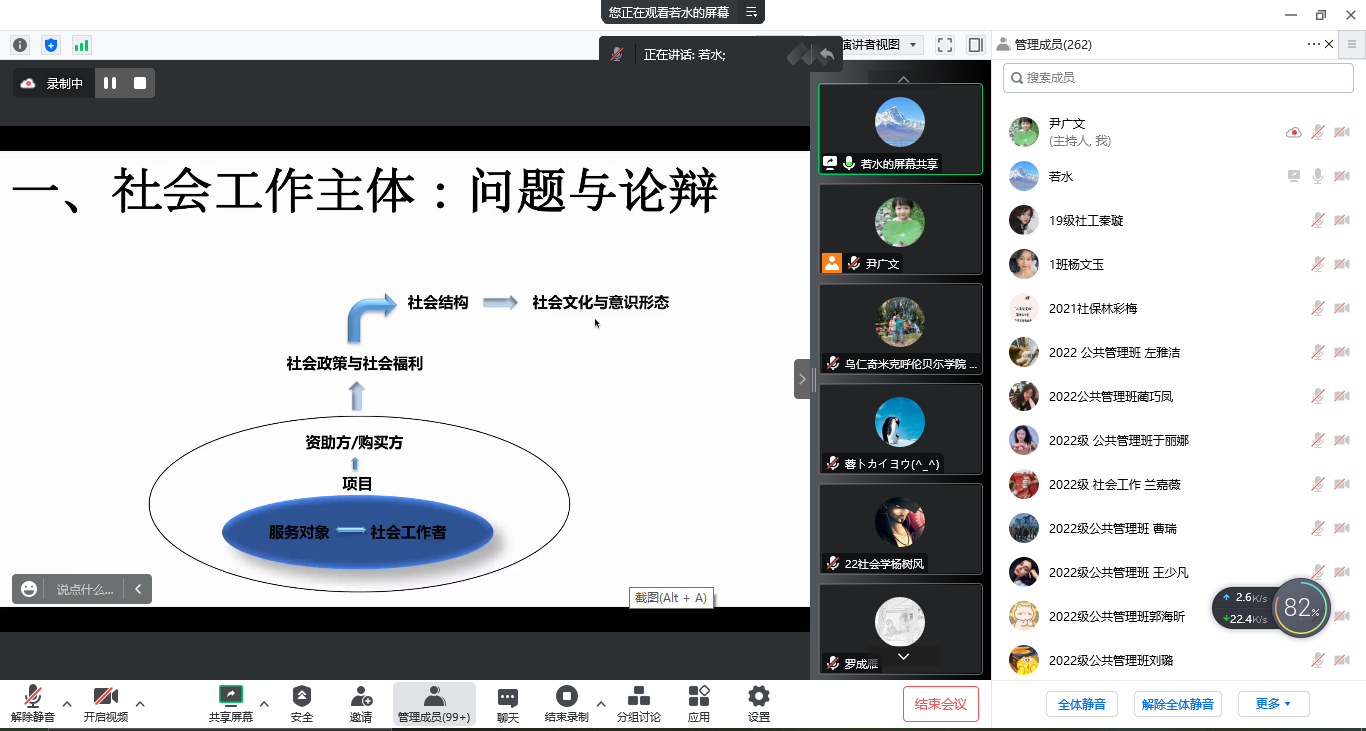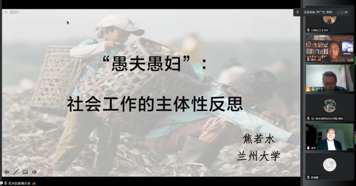 2022年10月19日19时,百廿校庆暨十年院庆校友论坛系列学术讲座第四场,由兰州大学焦若水教授开讲。焦老师为我院师生作题为“‘愚夫愚妇’:社会工作的主体性反思”的学术讲座。本次讲座由尹广文副教授主持,甘肃政法大学公共管理学院任文启教授作评议人,近三百名师生参加。
