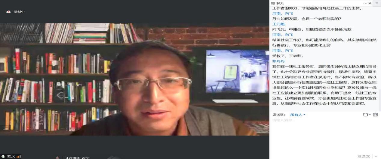 在交流互动环节中,我院师生积极在评论区向焦老师提出有关社会工作发展的各项问题,焦老师都一一耐心回应,认真解答。讲座尾声,甘肃政法大学任文启教授根据焦老师的学术讲座,作出三点总结:一是中国社会工作要避免社会工作“神学化”的倾向,勇于承认自身的不足,要实实在在做一些事,才能知道未来在哪;二是要在中国现存的福利制度框架内确定社会工作的边界;三是“位”与“育”可以在现阶段中国社会工作发展上有差距。任文启教授指出目前中国社会工作处于“能做”阶段,距离“想做”、“需要做”还有一段距离,因此,在现阶段社会工作的发展可以“位”先于“育”。