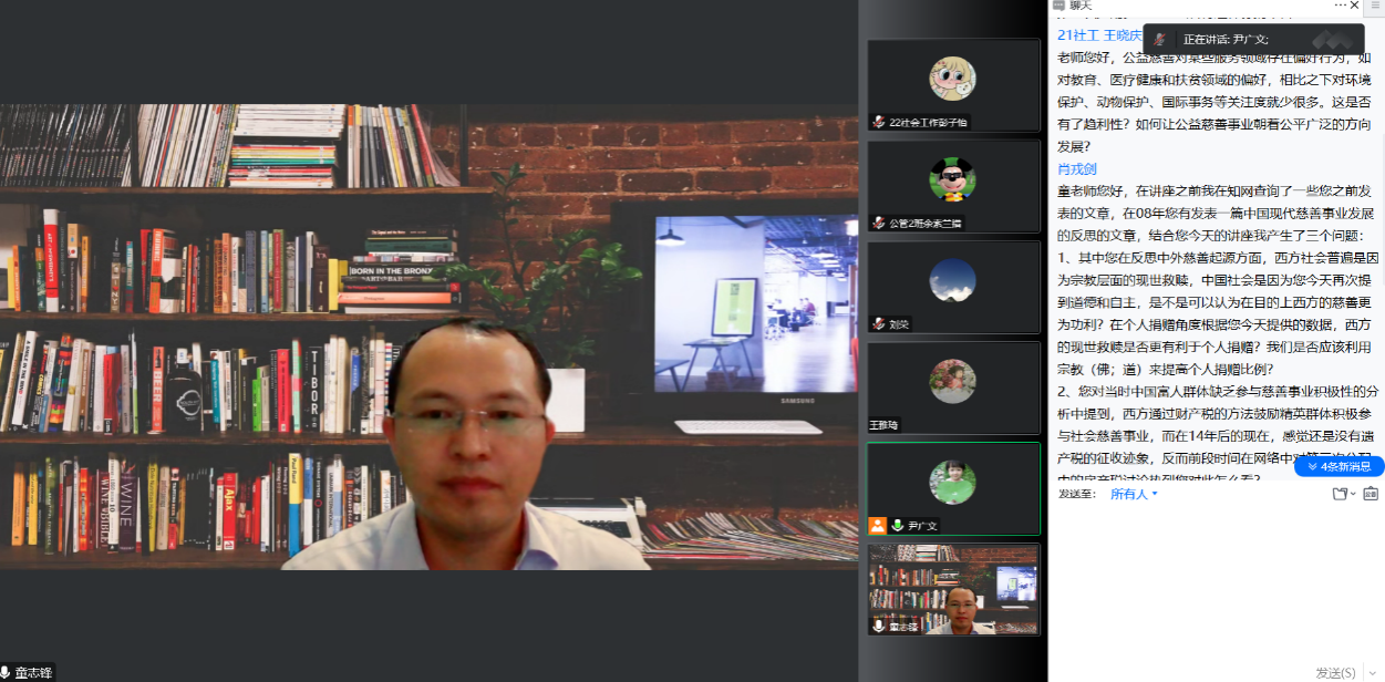 讲座接近尾声,我院师生与童老师关于第三次分配进行深入讨论和交流,童老师以深厚的专业知识对同学们所提问题作了解答。最后,李怀老师对本次讲座内容进行了以下总结和分享:第一,第三次分配不等于公益慈善,第三次分配所包含的主体、范畴更加广泛;第二,第三次分配同样是一种基础性分配制度,这就决定了三类分配制度在实现共同富裕道路中的价值和角色怎么摆布的问题;第三,我们应该思考如何让第三种分配作为一种基础性制度得到保障,同时给予我们一个深刻的启发——如果说再分配制度属于国家,市场制度属于市场,第三次分配制度则是让社会领域发挥更大的效应,因此第三次分配制度可以和社会之间的关系很好地切合,这将是社会学学科未来大有建树的领域。