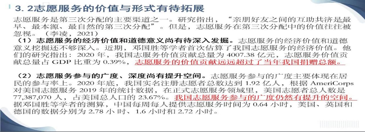 再次,童老师讲述了第三次分配存在的风险和挑战,一是慈善捐赠占GDP比重与结构尚不合理,慈善捐赠总量有所增长,但占GDP比重依然较低;二是志愿服务的价值与形式有待拓展,志愿服务的经济价值和道德意义尚有待深入发掘,志愿服务参与的广度、深度尚有提升空间;三是共享经济等第三次分配的新势力的社会价值有待深挖,包括非营利型共享经济的分配作用、社会企业的身份认定都存在困难等。