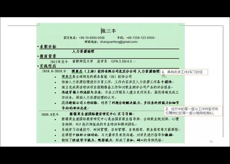 “制作简历是求职面试的第一步,一份好的简历是就职的敲门砖”。雷老师详细讲解了简历的结构和内容,并展示了优秀简历模板,避免同学们因制作简历失误而错失就业良机。