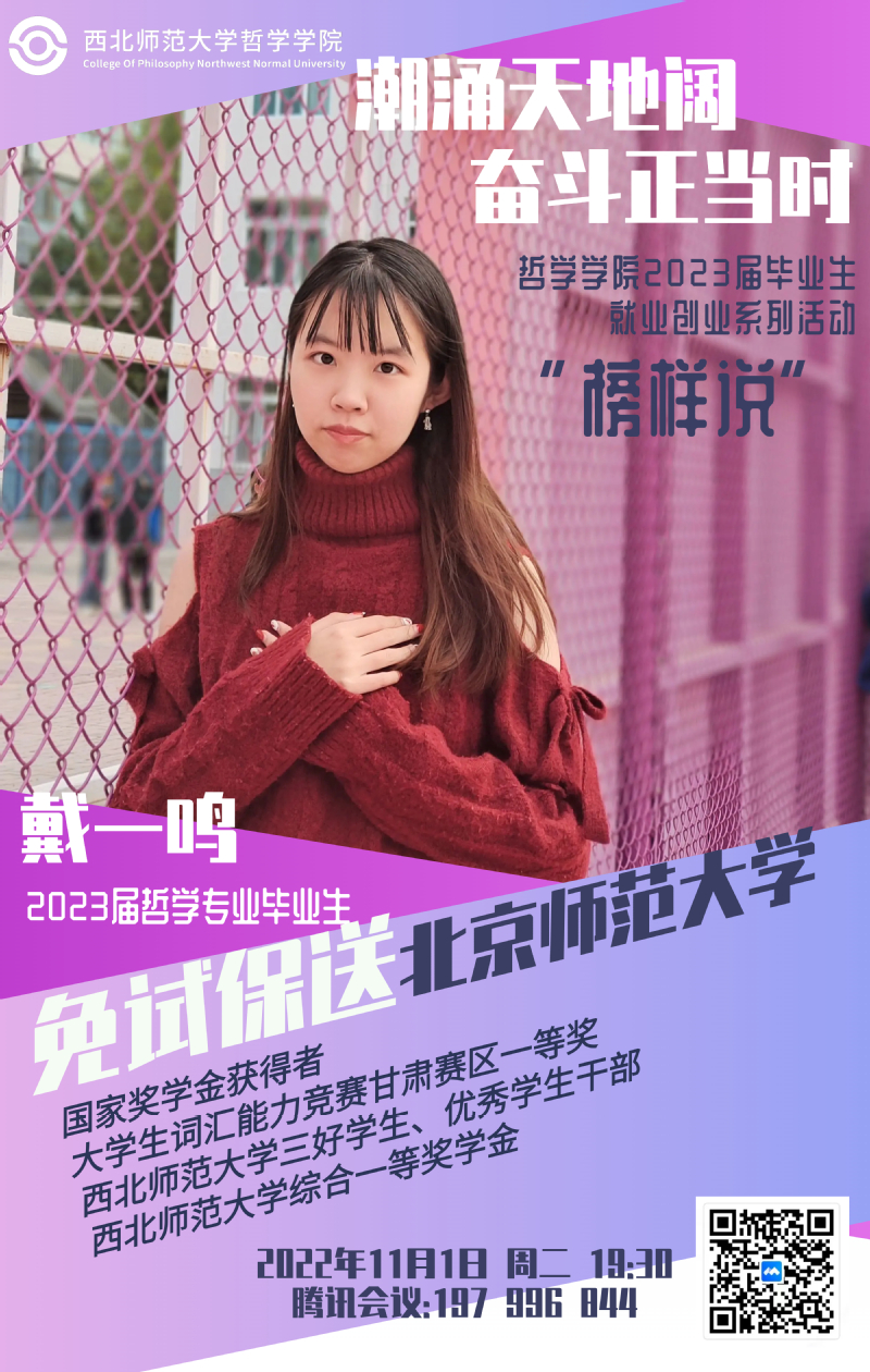 11月1日晚,学院通过腾讯会议线上举办了2023届毕业生就业指导活动——“榜样说”专题分享会,邀请2023届研究生推免资格获得者潘雨丹、戴一鸣两位同学做分享,由学院专职辅导员樊致君主持,2020级、2021级和2022级全体本科生参会。