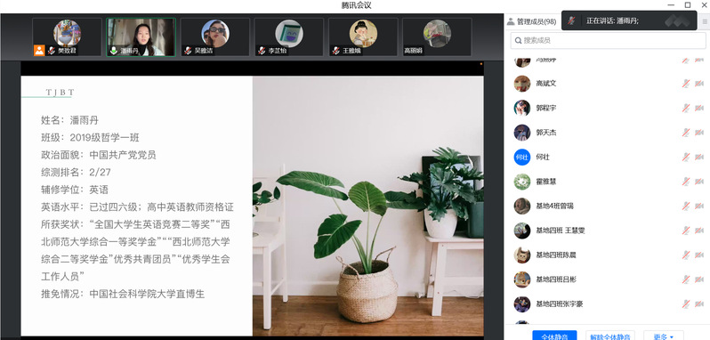 潘雨丹结合日常学习、学生工作、科研竞赛等方面遇到的问题详细地跟学弟学妹梳理了自己在学习、生活方面总结出来的好习惯。对于即将结束的大学生活,她说:“哲学学院见证了我们的成长,在这里,老师带我们领略不同哲学家的风采,带我们揭开看似深奥的思想背后的神秘面纱。在这里,我们为了惊奇而求知,为了求知而求知。在一步步检验疑团的过程中,我们收获的不止有精神上的充实,更有对自身价值的深刻认识。”