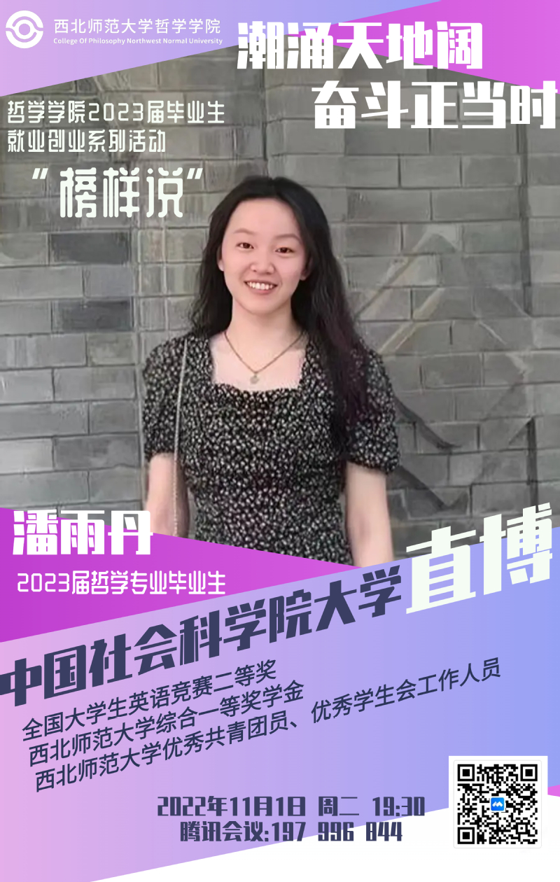 潘雨丹同学获得中国社会科学院大学直博资格,曾任学院学生会负责人。在校期间学习成绩优异,曾获“全国大学生英语竞赛二等奖”“英国365公司综合一等奖学金”“英国365公司综合二等奖学金”“优秀共青团员”“优秀学生会工作人员”等荣誉称号。
