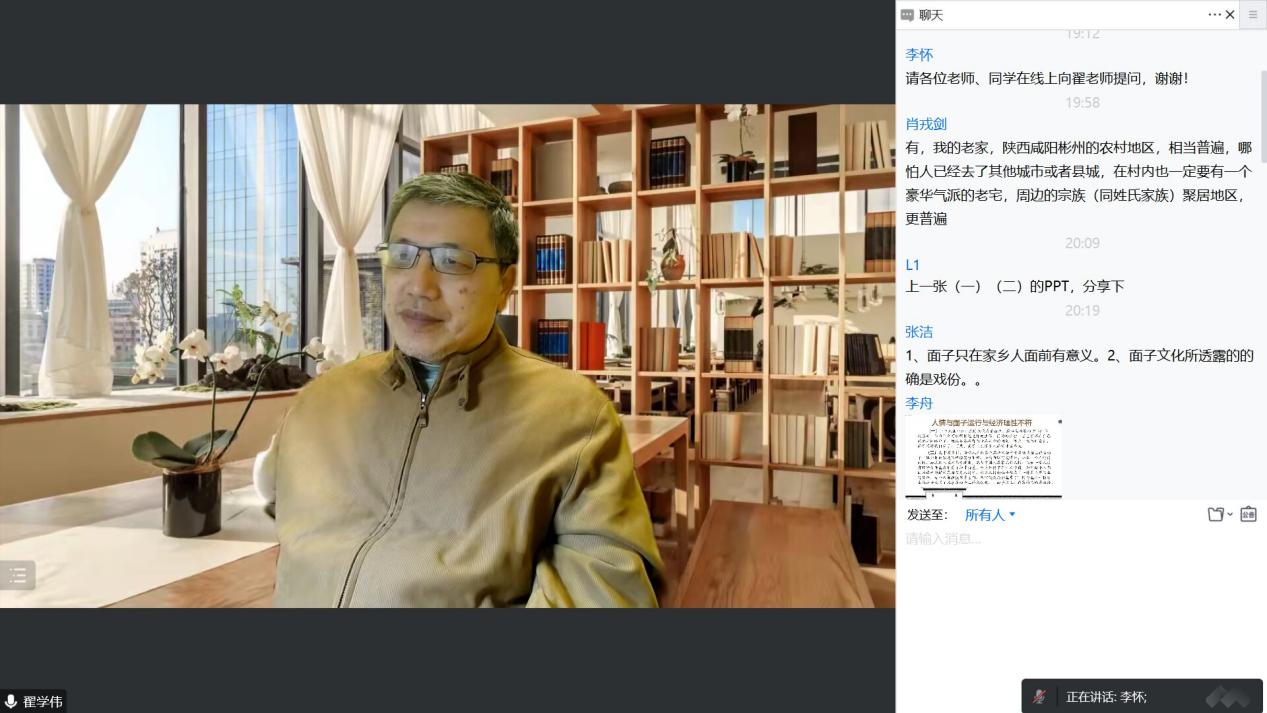 最后,我院师生与翟老师进行了积极互动,同学们对中国人情和面子及相关问题提出了疑问,翟老师做出了耐心解答。在讲座尾声,李怀老师对翟老师的精彩讲座表达了衷心的感谢,并做总结点评,第一个方面是该主题的历史追溯,让老师同学们了解了这个主题的起源与发展;第二个是通过中西方的对比更加深入的了解人情和面子;第三个是从经验视野出发,扎根于中国本土化的研究;第四个是从批判的视野出发,学术研究的推进和中国的实际情况都需要批判性思维。最后诚挚邀请翟老师在疫情结束后来英国365公司做线下讲座,进行更深入的学术交流与探讨。