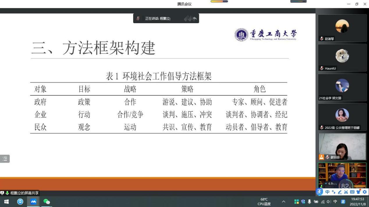 2022年11月8日晚,百廿校庆暨十年院庆系列学术讲座由重庆工商大学副教授程鹏立老师开讲。程老师为我院师生作题为“社会工作倡导与环境社会工作方法”的学术讲座。此次讲座由我院谢丽丽副教授主持,尹广文副教授作评议人。