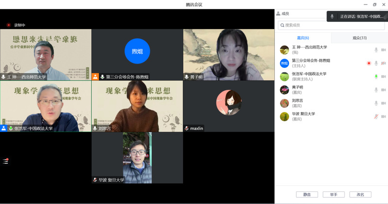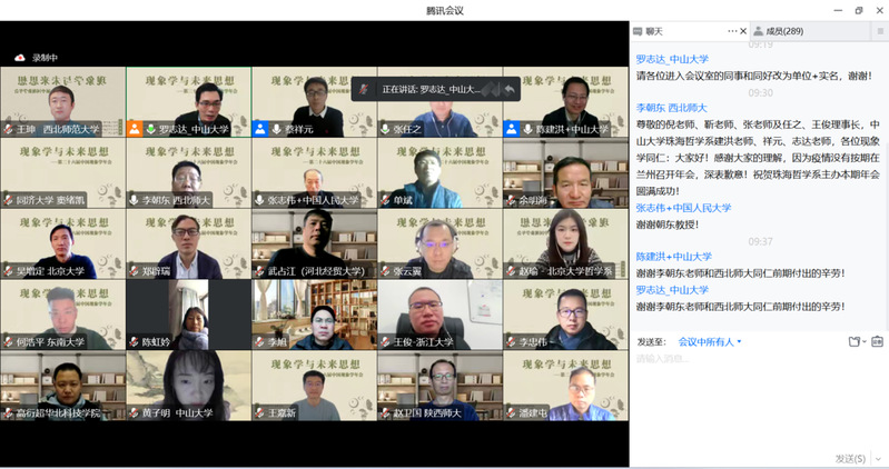 12月3-4日,第26届中国现象学年会通过腾讯会议在线上召开,本届年会的主题是“现象学与未来思想”,由中国现象学专业委员会、中山大学哲学系(珠海)、中山大学现象学文献与研究中心、中山大学“一带一路”研究院联合主办,来自全国各地的与会专家学者300余人参加了会议。我院李朝东教授、王珅副教授及10多名硕士、博士研究生参加了本次年会。
