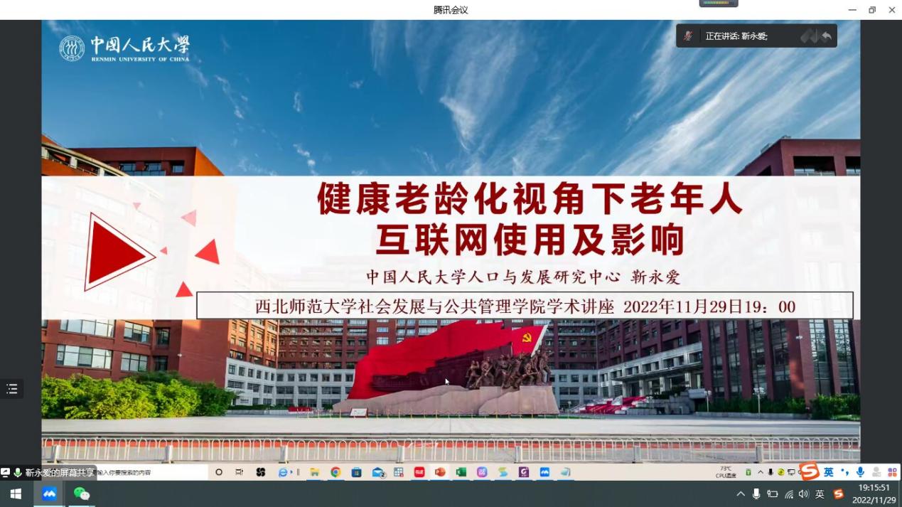 2022年11月29日19时,正值学校百廿校庆暨学院建院十周年院庆举行学术论坛系列学术讲座活动之际,应学院邀请,中国人民大学公共管理学院靳永爱教授莅临云端,在线为我院师生作了题为“健康老龄化视角下老年人互联网使用及影响”的学术讲座。本次讲座由王琪瑛老师主持,学院200多名师生参加了此次讲座。