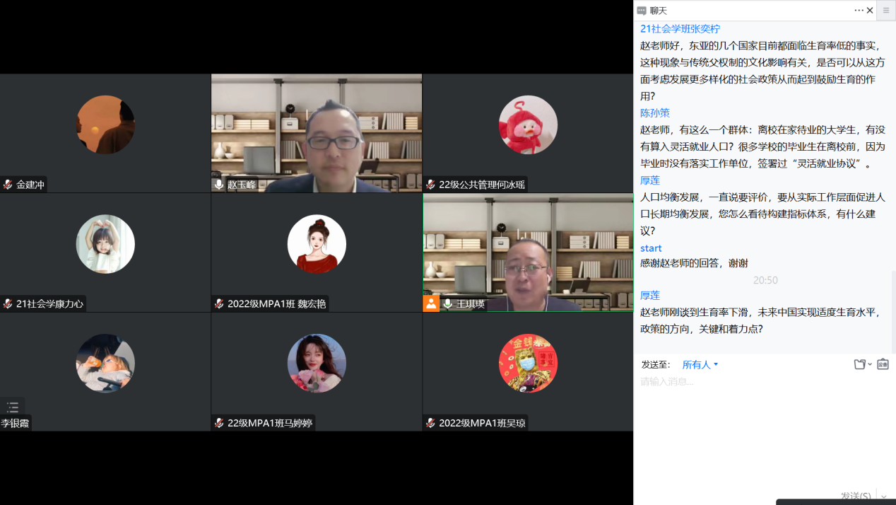 我院师生与赵老师进行了积极互动,同学们对中国人口结构变化与当代青年发展及相关问题提出了疑问,赵老师做出了耐心解答。互动环节结束后,王琪瑛老师总结了自己学习的心得。第一,讲座涵盖了人口学的许多问题领域,每一个部分都可以作为学术选题进行深入分析;第二,讲座不仅对人口学基本理论和方法进行了回顾,并对低生育陷阱、青年社会融合、人口塌陷、人口预测和人口均衡发展理论等学术热点问题贡献了真知灼见。第三,在学术研究中,必须高度重视青年问题的研究。同时,王老师结合自己的体验,讲到如何做一名合格的研究生。希望同学们在问题领域、理论视角和研究方法、技术等层面做好学术训练。讲座尾声,王老师对赵老师的精彩演讲表达了衷心的感谢并诚挚邀请赵老师在疫情结束后来英国365公司做线下讲座,进行更深入的学术交流与探讨。
